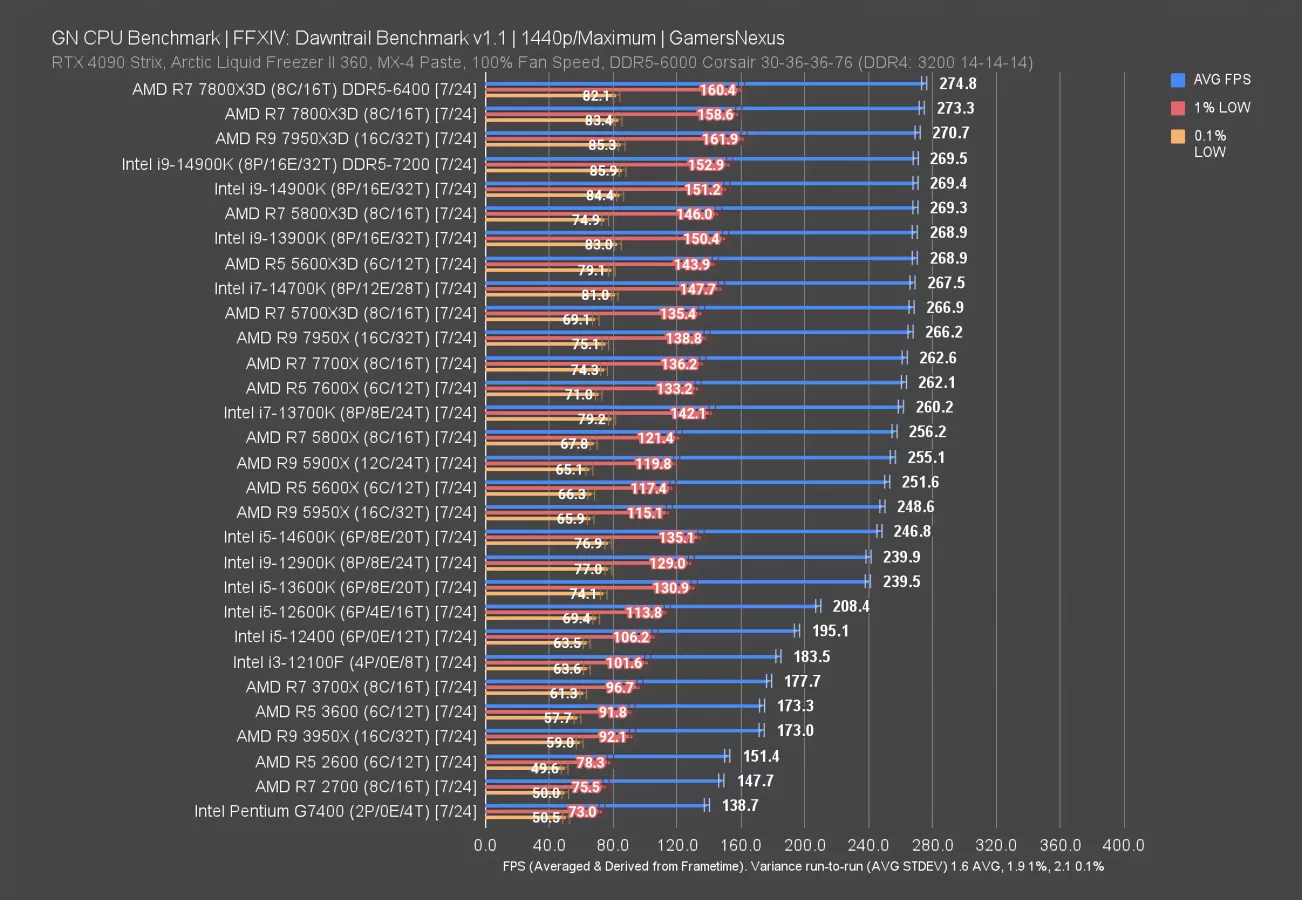 The 5700X3D would give an uplift of 50% from the 3700X and 54% from the 3600. The 5800X3D (watch our review) does a little better, but the top of this chart is getting squashed for scaling by the additional load of 1440p. The 7800X3D’s 273 FPS AVG posts a similar 54% to 58% lead from these CPUs, limited by GPU scaling.