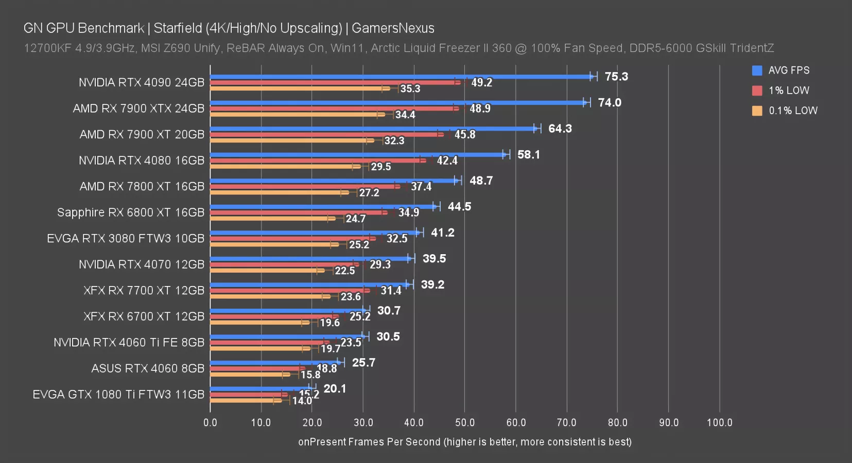 In Starfield at 4K/High, we had the 7900 XTX at 74 FPS AVG and the 7900 XT at 64 FPS AVG. That’s a 15% improvement with the XTX. The 4080 is left in the dust by the 7900 XTX, which has a 27% lead. The XT has an 11% lead.