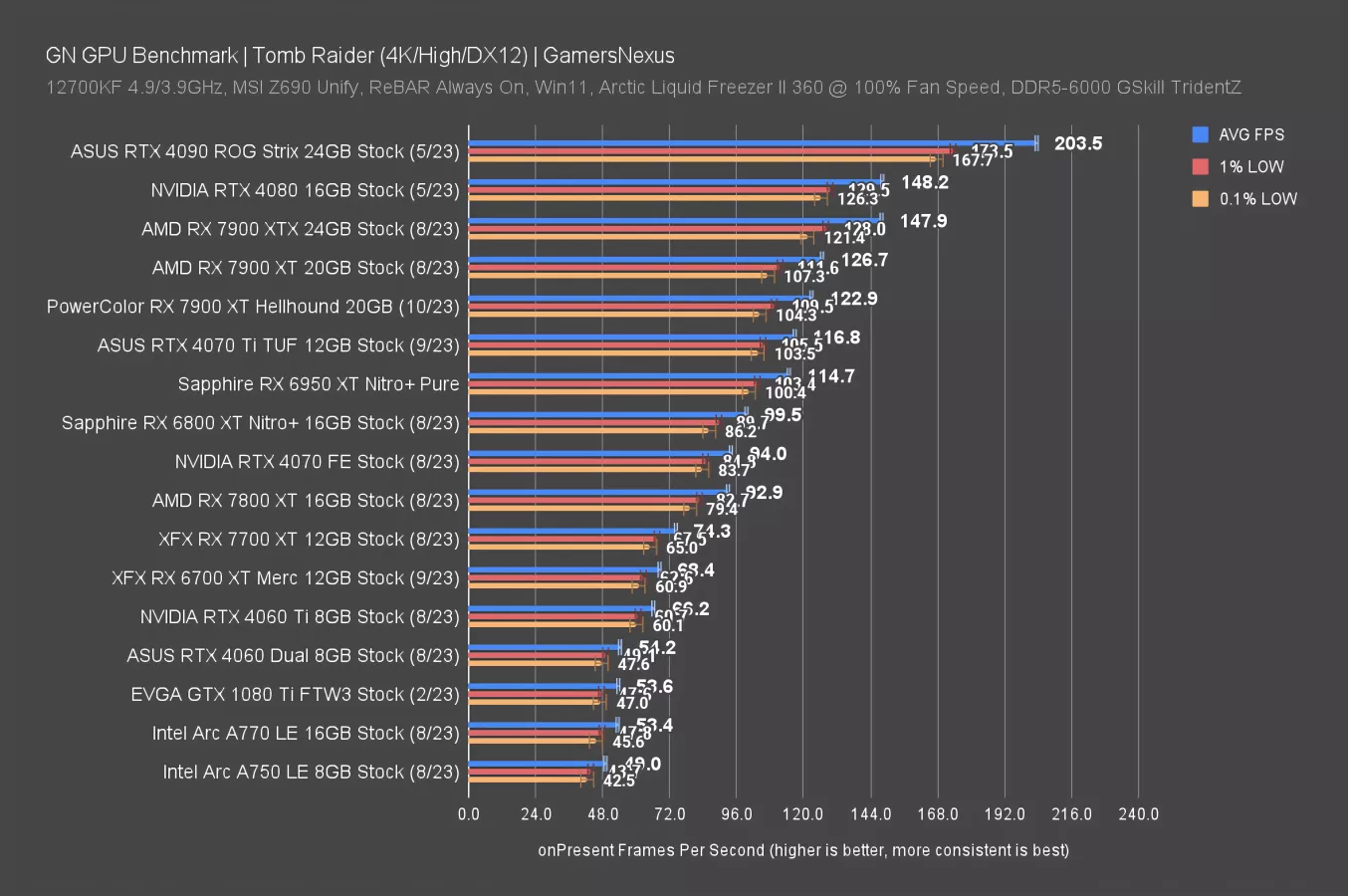 In Shadow of the Tomb Raider at 4K/High, the RX 7900 XT ran at about 123-127FPS AVG. That has the XTX about 17% ahead. The RTX 4080 is roughly tied with that, with the 4090 establishing a ceiling. The 4070 Ti isn’t too far back, with the 7900 XT ahead by 5% to 8.5%, depending which card it is. The 6950 XT remains compelling value here, with nearly equal performance to the 4070 Ti but a $200 cheaper price.