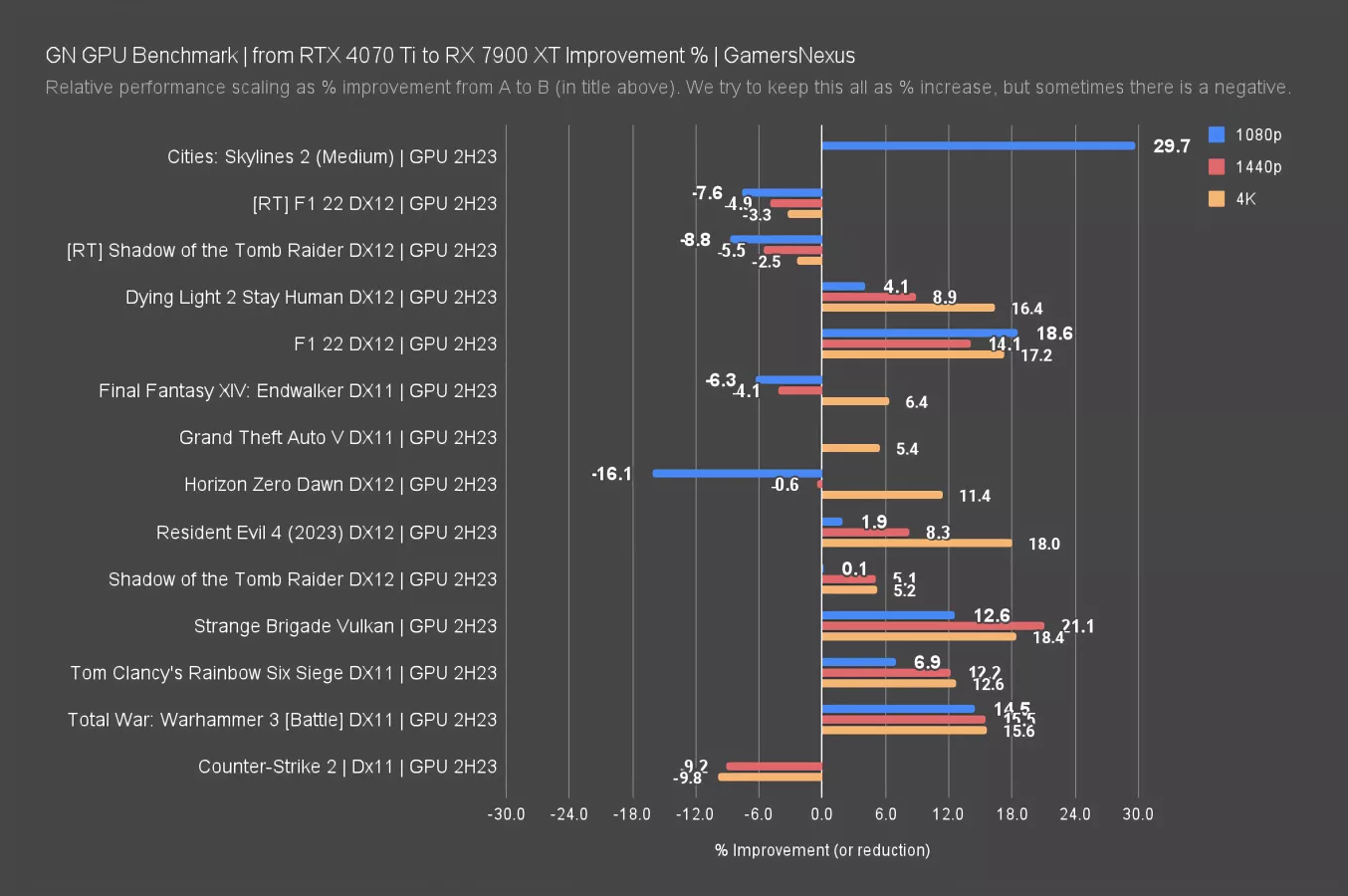The RX 7900 XT has the majority of victories, and most of them are double-digit victories. The Skylines 2 test was particularly wild, although that game is one of the worst-optimized games we’ve tested in a long time. But it’s still a valid lead.