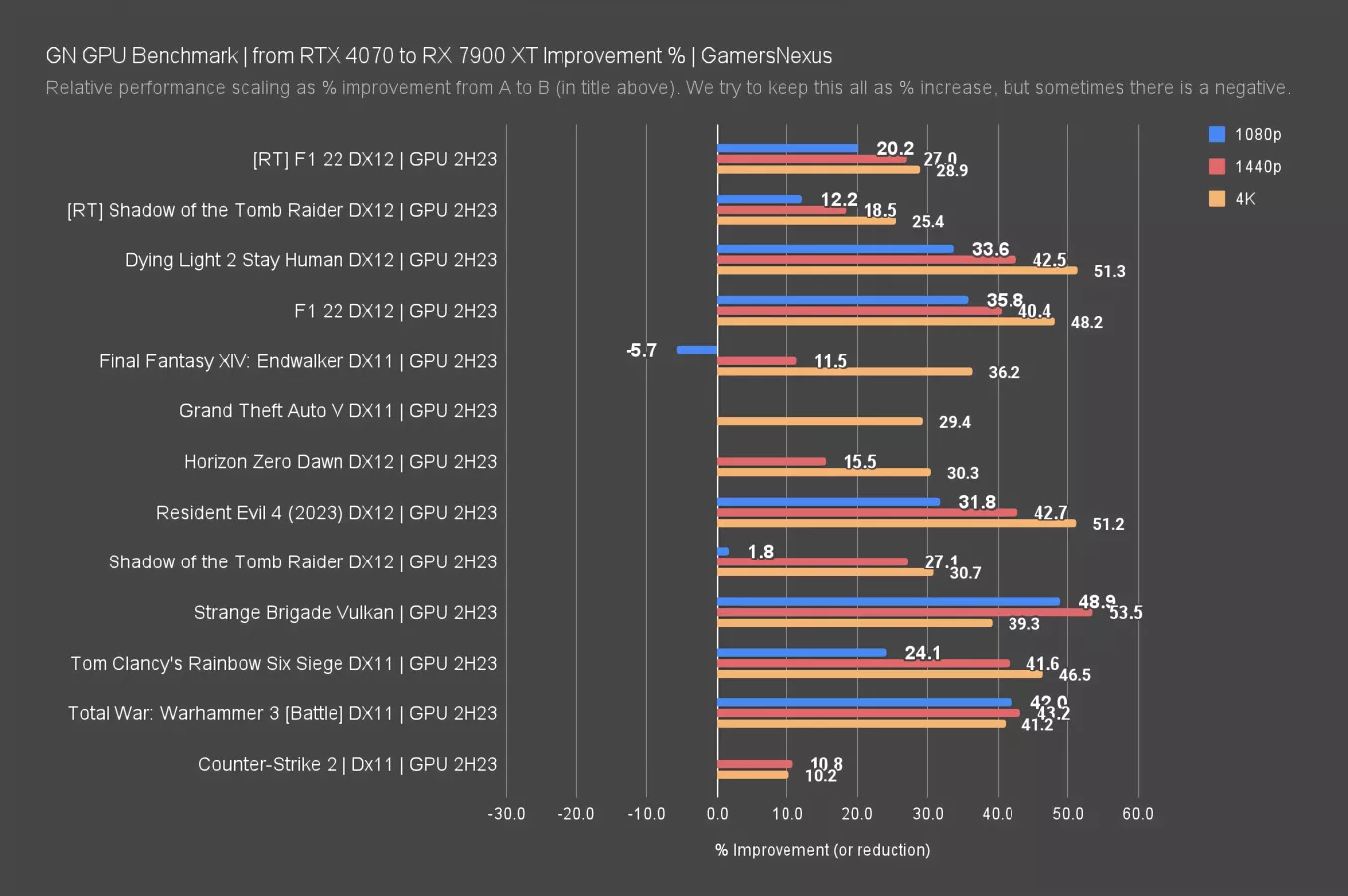 The 7900 XT maintains an advantage in the 40-50% range for many of these games when at 4K. The 1080p results are often CPU-bound, hence lower scaling.