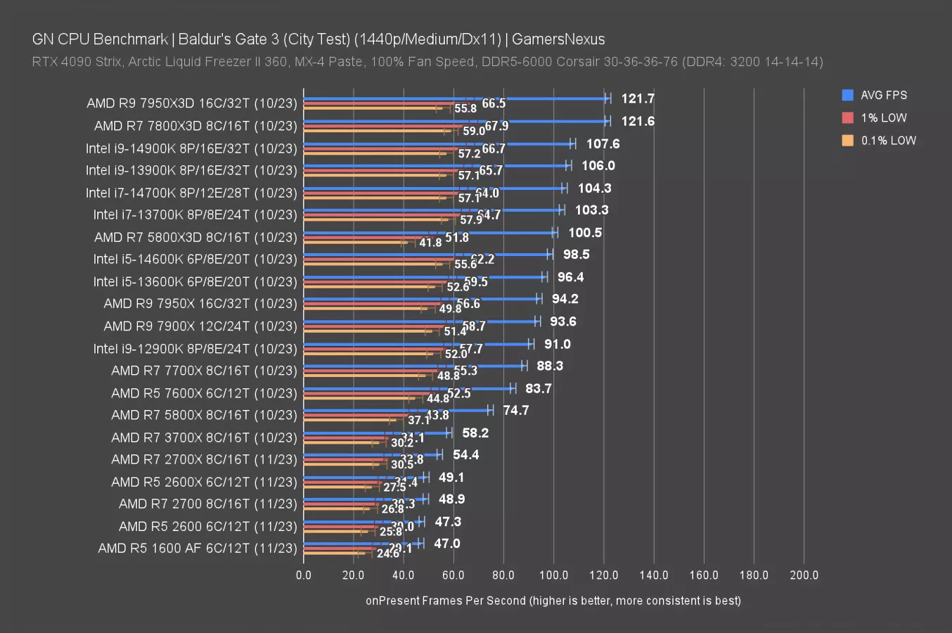 Baldur’s Gate 3 is up first, tested at 1080p/medium. This one has been a reliable CPU load and shows clean scaling for most parts tested, but especially for these older CPUs.