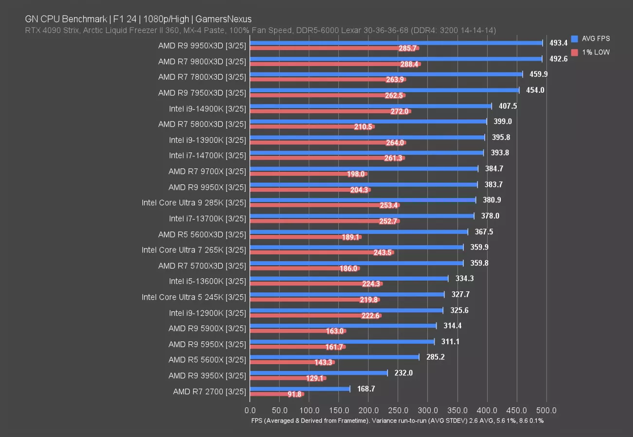 The 5800X3D (watch our review) remains an excellent CPU, up at 119 FPS AVG. The 9950X3D and 9800X3D outrank it by about 30%. As for Intel, it remains uncompetitive here. The 285K is getting crushed by two prior Intel generations for reasons discussed in that review, and that’s with new Windows updates.
