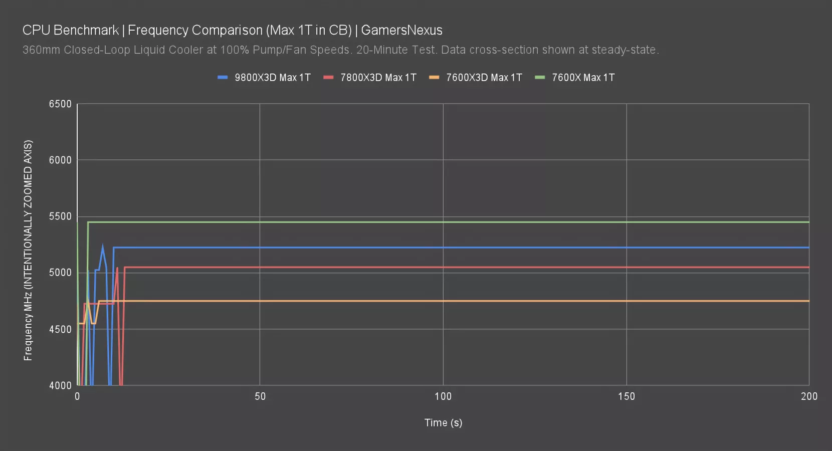 The 9800X3D we just reviewed held the same 5225 MHz clock we saw in all-core testing and did so throughout the benchmark.