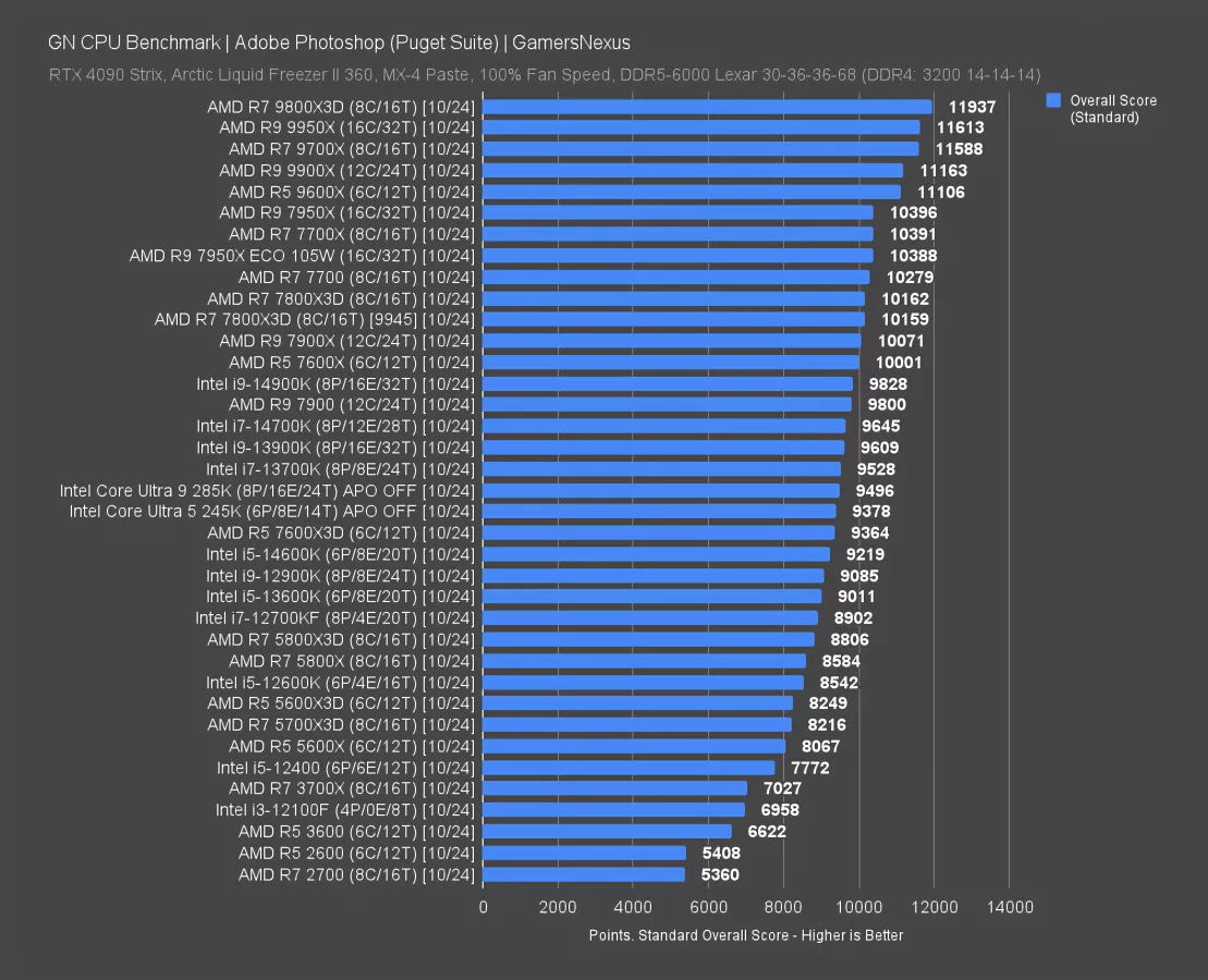 In Adobe Photoshop and tested with Puget Suite again, the 7600X3D fell down the charts to 14600K levels of performance and functionally tied with the 245K. That’s an OK spot to be, but AMD dominates the top half of this chart with other components -- including the 7600X. The reason for this drop comes down to the loss in frequency, which is important to Photoshop right now.