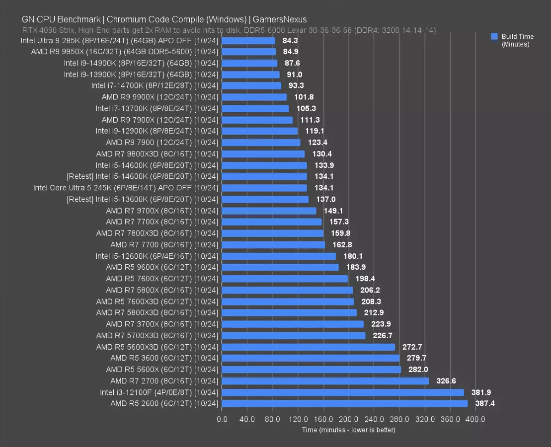 The real takeaway though is that Intel continues to get bodied by X3D: the 265K and 285K both suffer from the same impact we saw to the 14900K (read our review) and 13900K, where frametime consistency plummets and large frametime spikes pop-up more frequently. This affects the averaging as well, since it drags everything down, which leads to the 285K and 265K seeming to perform worse than a lower thread-count 245K. This is a repeatable result. Even the DDR5-8600 285K entry has worse lows than the 245K, and that’s all because of scheduling. There are community mods to try and help with this, but we test games as the developer ships and maintains them.