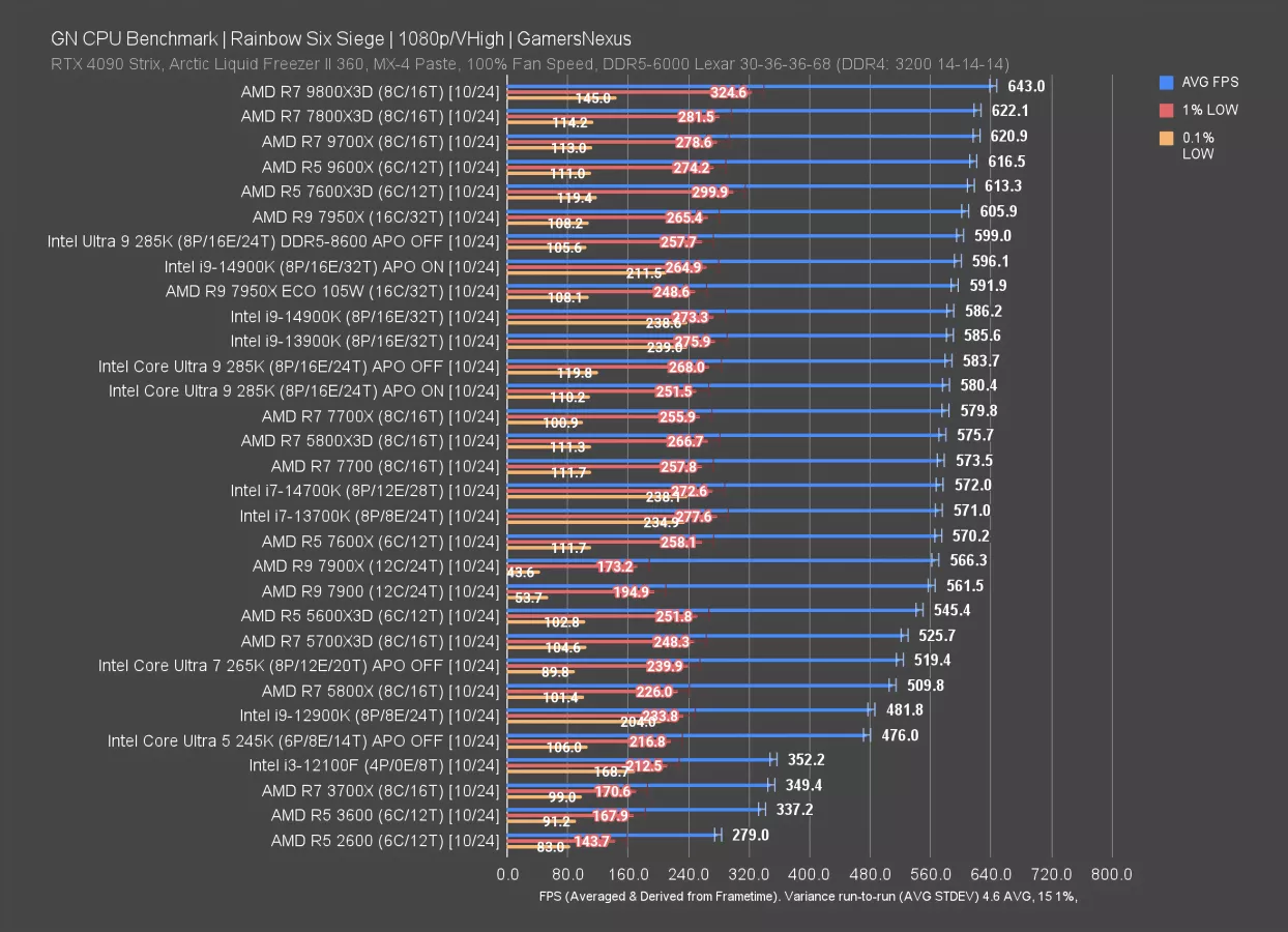 Rainbow Six Siege is up now. In this one, the 7600X3D ran at 613 FPS AVG -- sorry, 613.3… That 0.3 is important, because elite FPS gamers can see even the difference between 0.000798 ms.