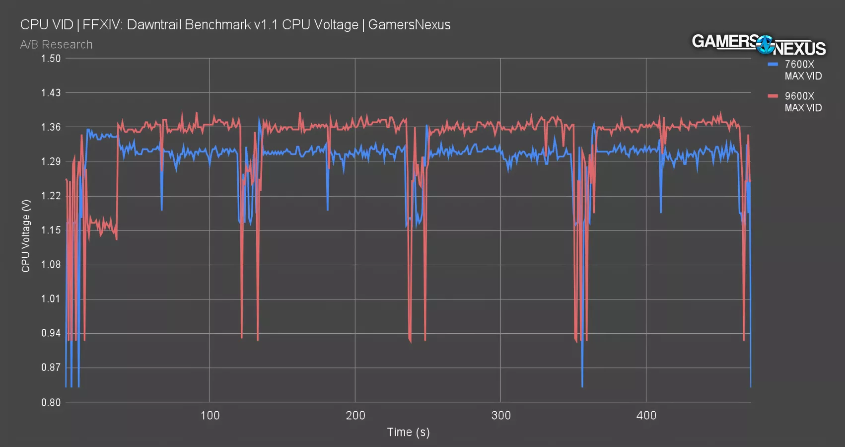 Here’s the Max VID chart for Final Fantasy XIV: Dawntrail. In this test, the 9600X plots 1.36-1.37 maximum VID point-to-point. Keep in mind that this is done with software logging, not an oscilloscope, so we aren’t catching any spikes that are on the scale of microseconds. We can’t see transients here.