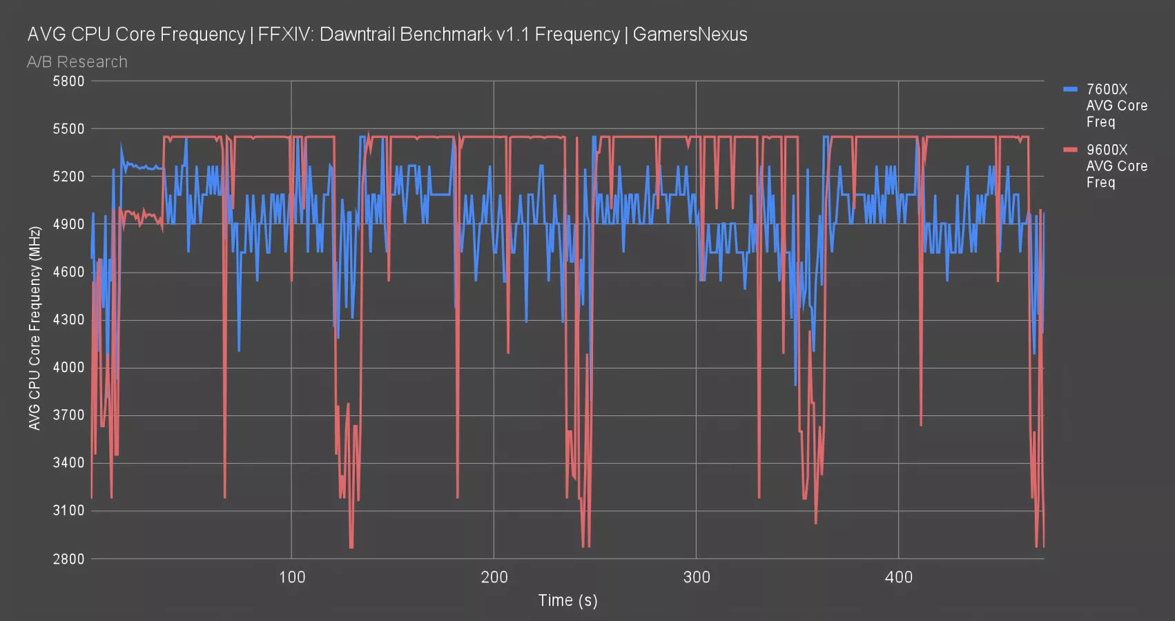 Here’s the frequency chart. In this one, The average all-core frequency has the 9600X basically pegged to 5450MHz, which explains the behavior we were seeing entirely. The 9600X is holding a higher clock, whereas the 7600X is fluctuating constantly with an average of around 4900 to 5000 MHz.