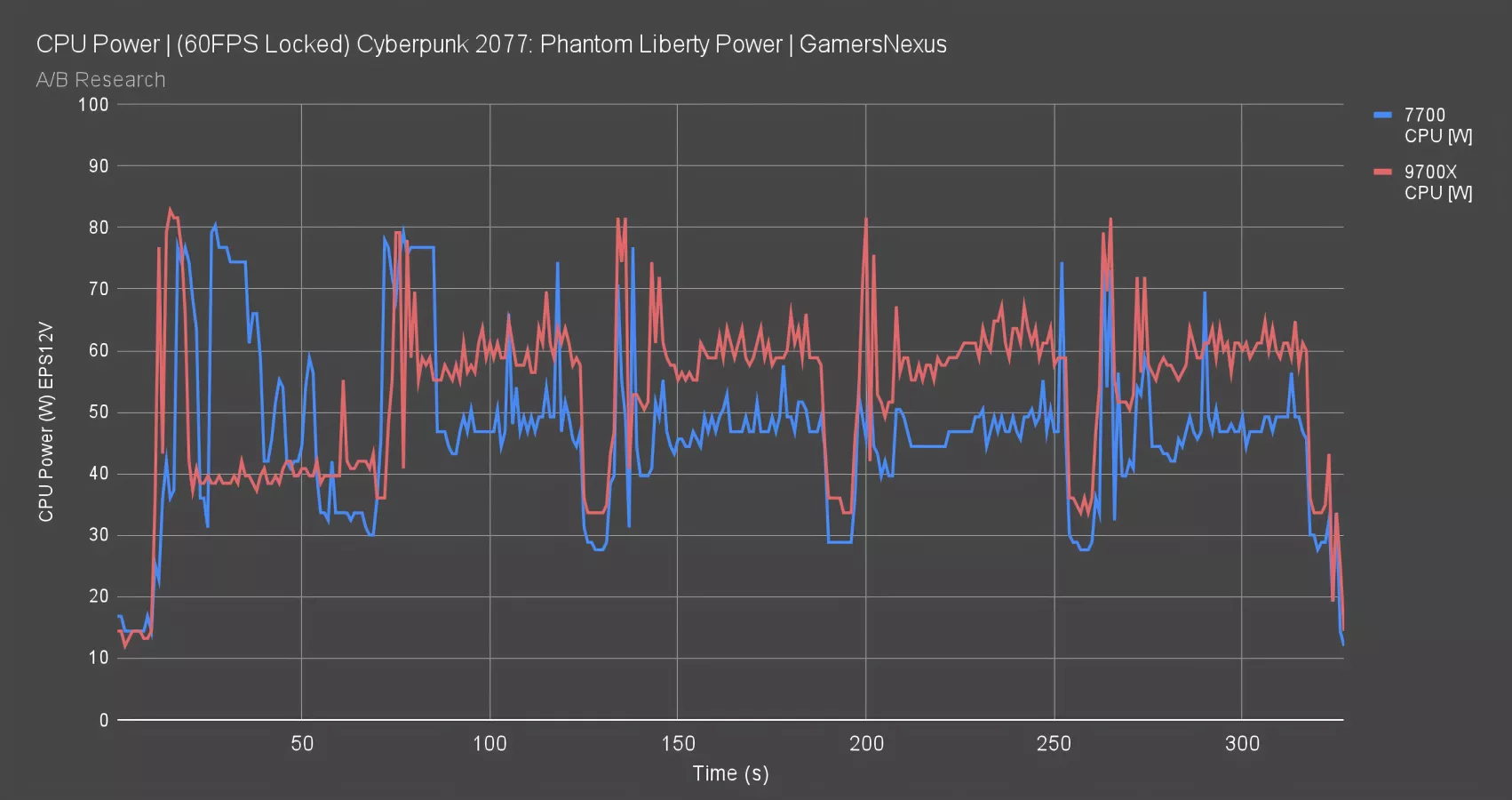 Locking the 9700X and 7700 both to 60 FPS but allowing power to do whatever it wants, the 7700 ends up achieving the same framerate for less power. We think this might have to do with voltage -- we’ll look at that in a moment.