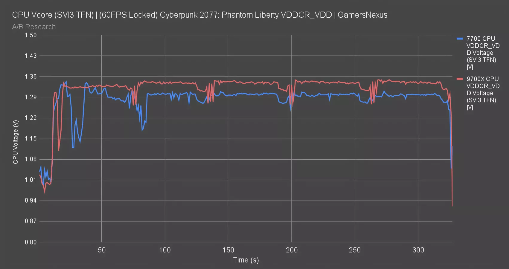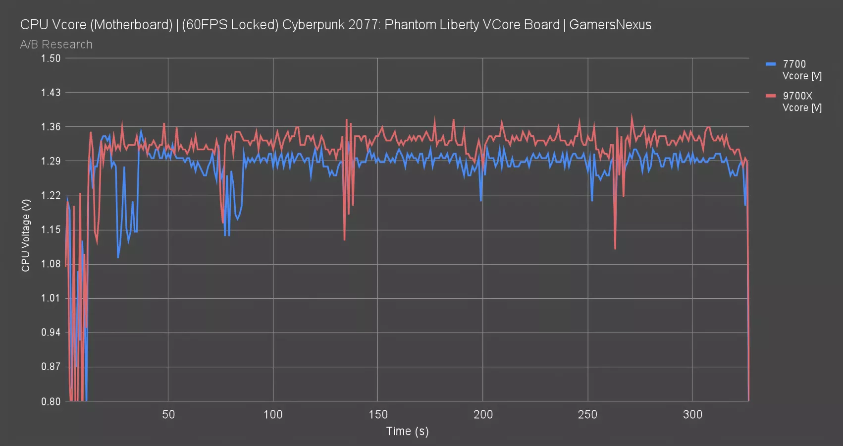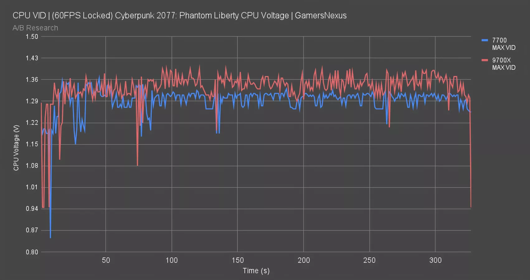 This chart shows the max VID of our 9700X vs. our 7700 when both are locked to 60 FPS, with the 9700X running higher voltage.
