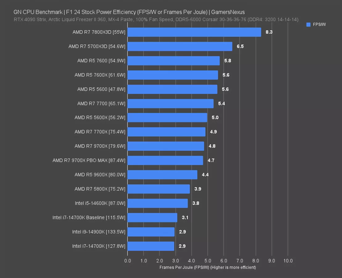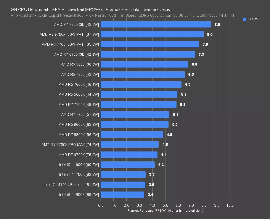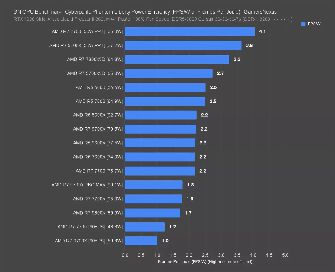 This chart shows the FPS/W in Phantom Liberty, where the 9600X in particular gets crushed by not only the 7800X3D but also by the 7600 and only barely equates the 7600X.