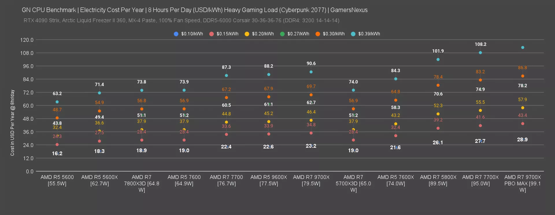 For the 7800X3D, those numbers would be about the same. The 9700X would plot at $23 for the floor in these conditions, or $91 for the ceiling. Obviously, all of these numbers decrease with less use, or could increase with higher electricity cost. This isn’t a benchmark, it’s just math -- so you can apply this to your own situation by looking up a kWh cost calculator and estimating your usage.