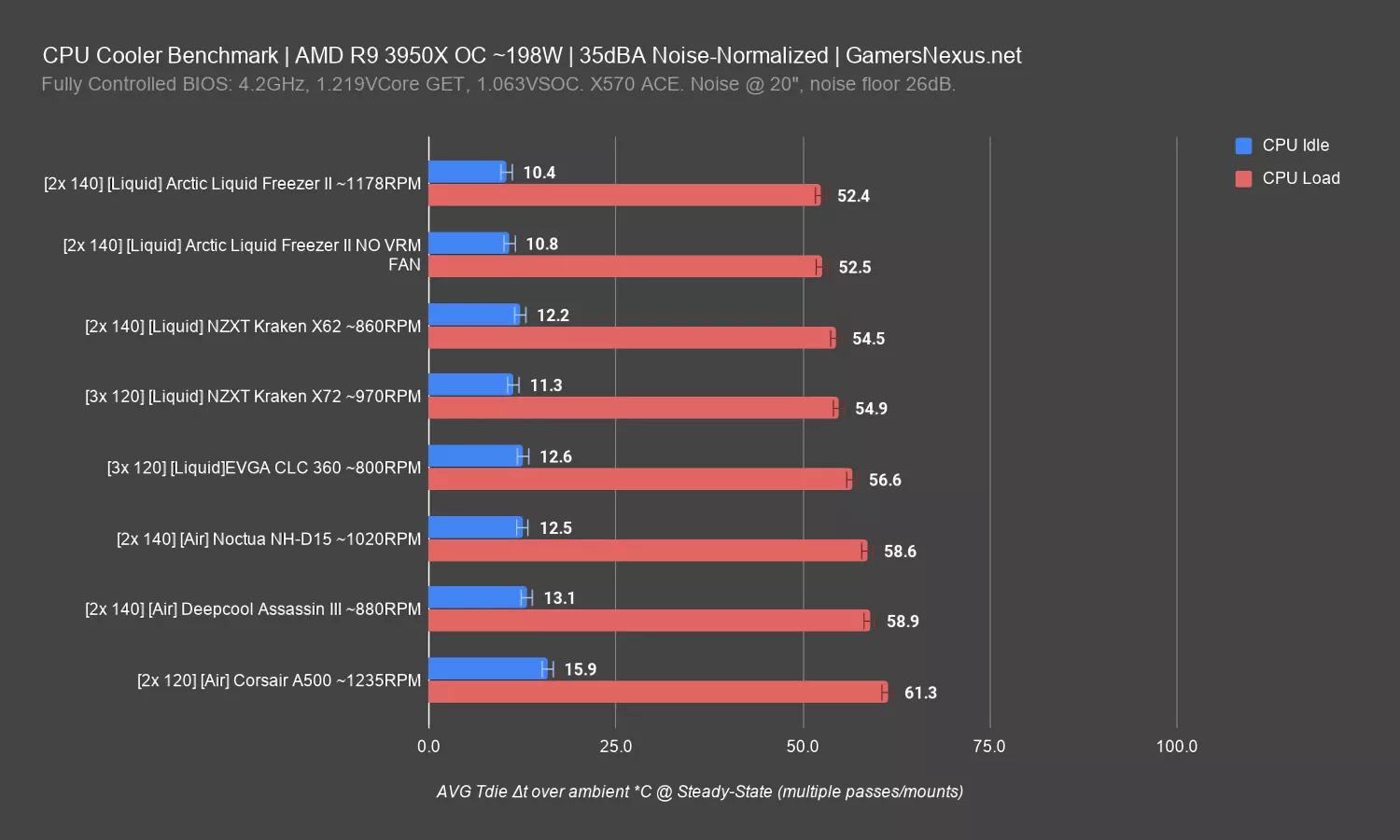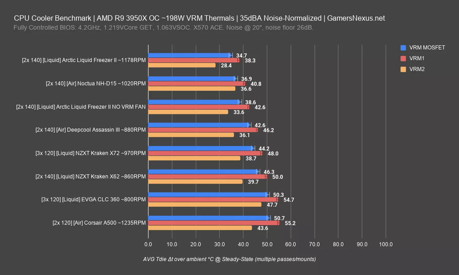 Our next chart will be of the VRM fan performance, but we’ll start with the one everyone is used to. For this one, we’re using a 200W workload with the AMD R9 3950X, which is more useful for stressing the differences in high-end coolers. This test is equalized to 35dBA in order to level the playing field so that coolers can’t just brute-force their way to the top, like the EVGA CLC 360 would do at its 60dBA baseline for noise at 100% speed.