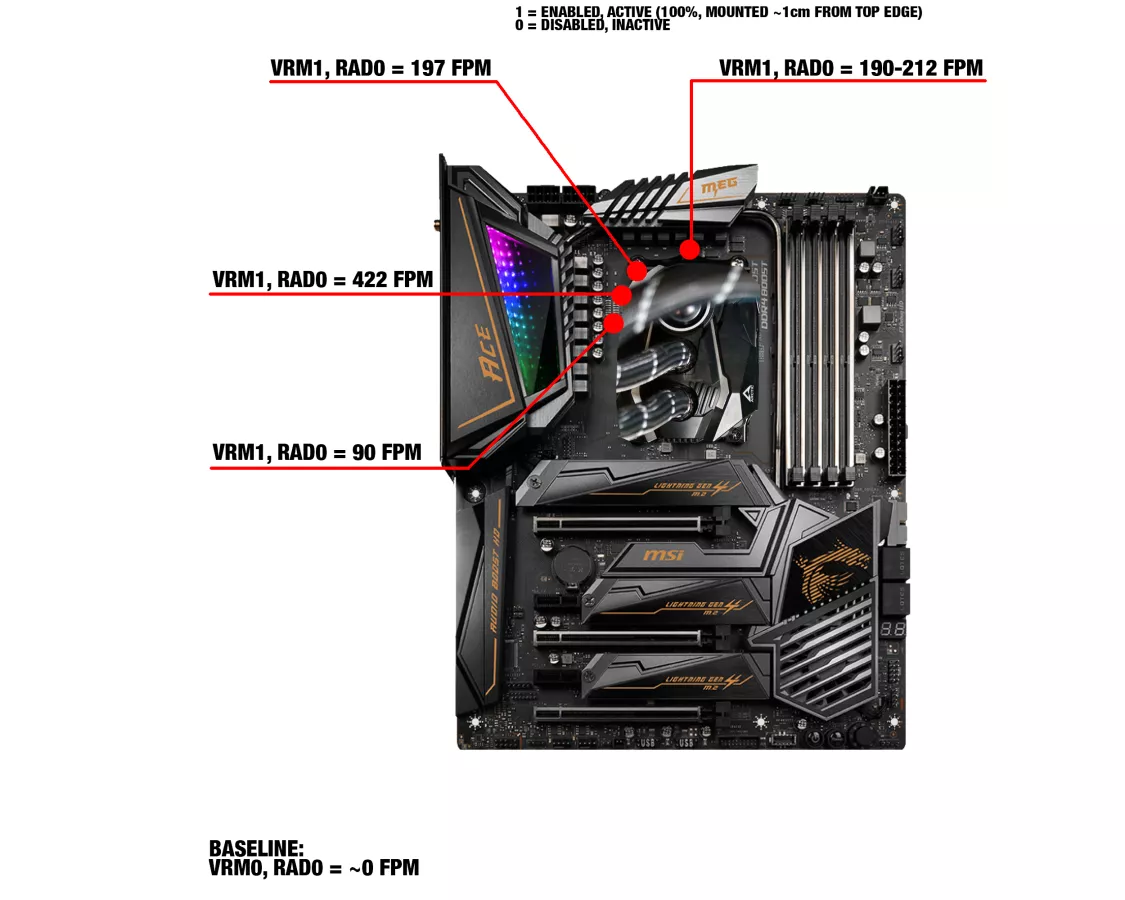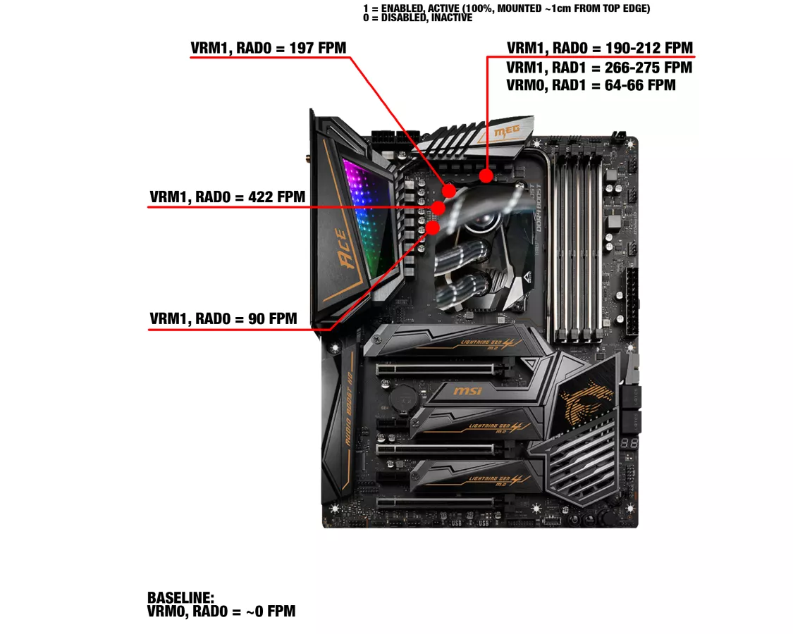 The next test will be for the VRM fan. For this, we’re going to start with an overlay demonstrating the linear feet per minute flow, often called FPM or LPM, as measured with a hotwire anemometer at the edge of the chassis for the cooler. The measurement is taken at an angle toward the VRM heatsink and the chassis is defined as the pump block housing typically (where the coldplate is). We measured at a few points and under a few conditions.