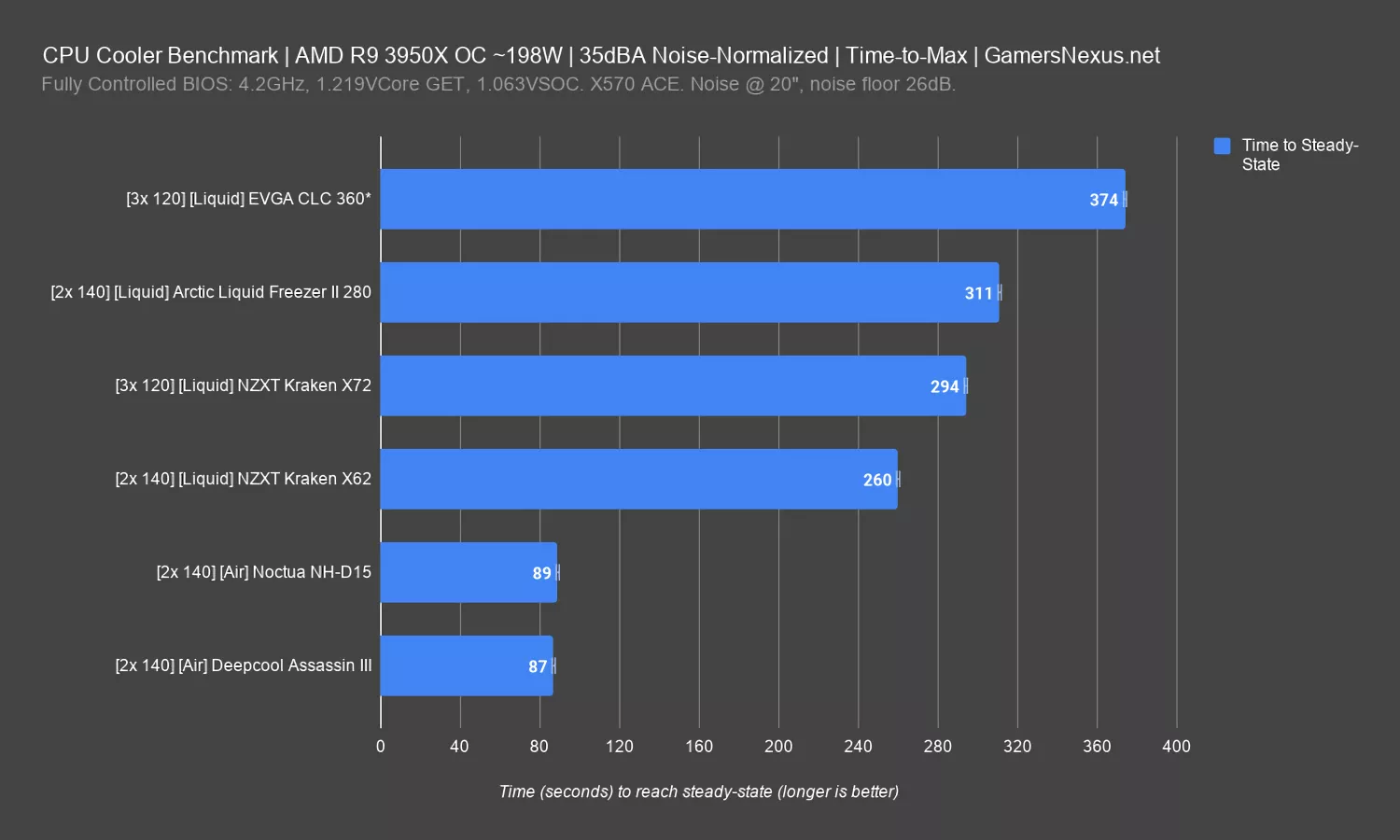 This next chart is quick. This is our time to steady state at a noise-normalized 35dBA, or the time at which we reach equilibrium on the 3950X. Liquid coolers take longer to reach equilibrium than air coolers as a result of their water capacity that soaks rapid heat changes better. Big air coolers have well-marked advantages, mostly the install-and-forget benefit, but also reach steady state in a quicker time - just 90 with the thermal load that we are testing. Liquid coolers afford longer periods of low thermals for bursty workloads, which can also help with controlling or soaking fan speed changes with any kind of fan curve. That’s discussed in the previous video, but the Arctic cooler is the new item for this chart.