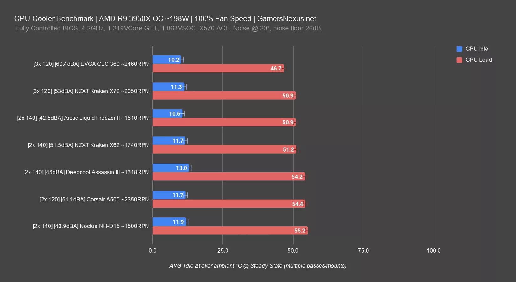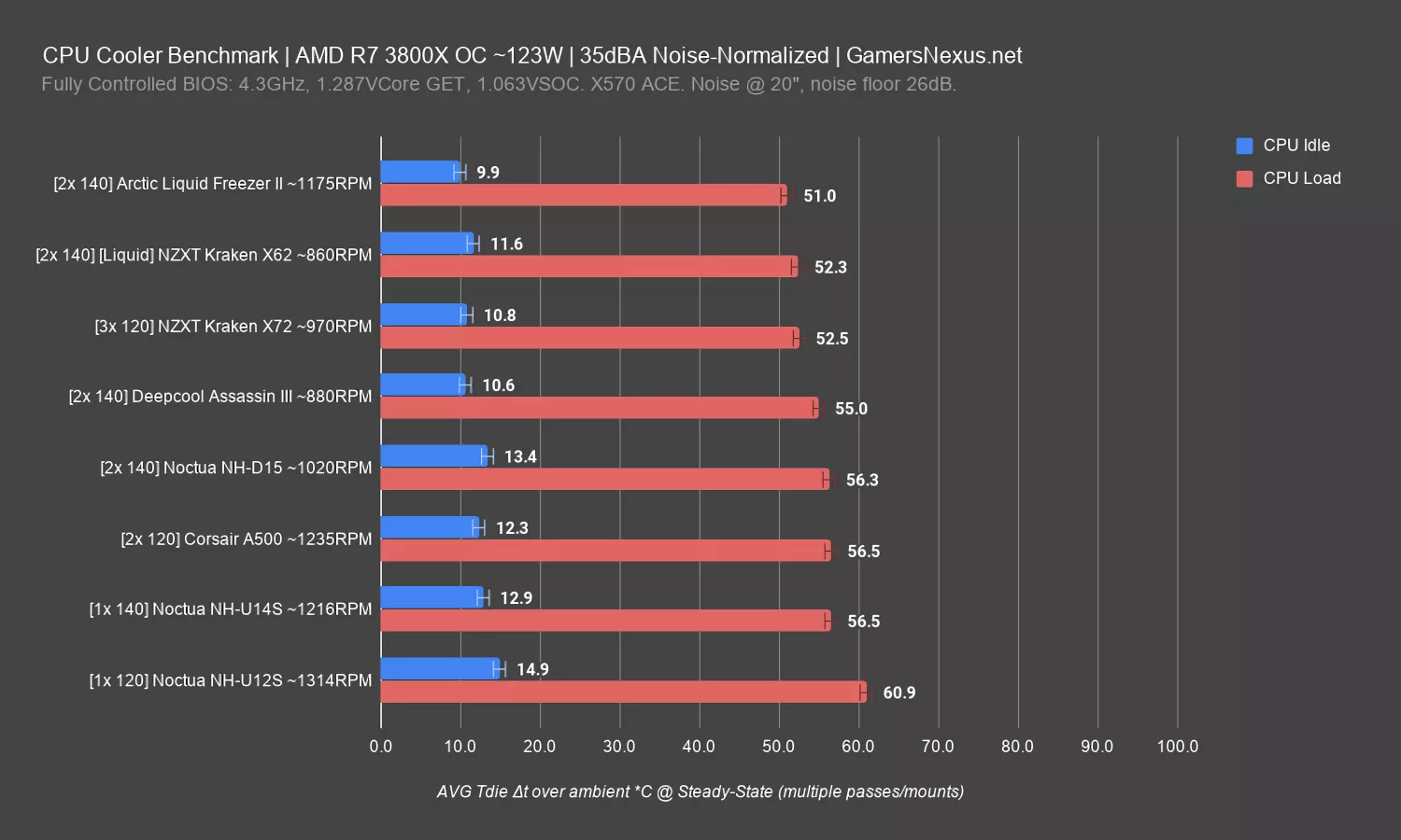 The 3800X was intended to be our standardized platform before we got to these higher-end coolers, the charts level-off a bit with the big air coolers and the liquid coolers as discussed in the two recent cooler videos we did. The reason they level off is because the heat load isn’t enough and the gap between coolers begins to shrink. These larger coolers do better at showing their differences once there’s a higher heat load that can stress the smaller coolers beyond what they’re really capable of. This is why the NH-U14S does so well relative to the large air coolers in this specific test.