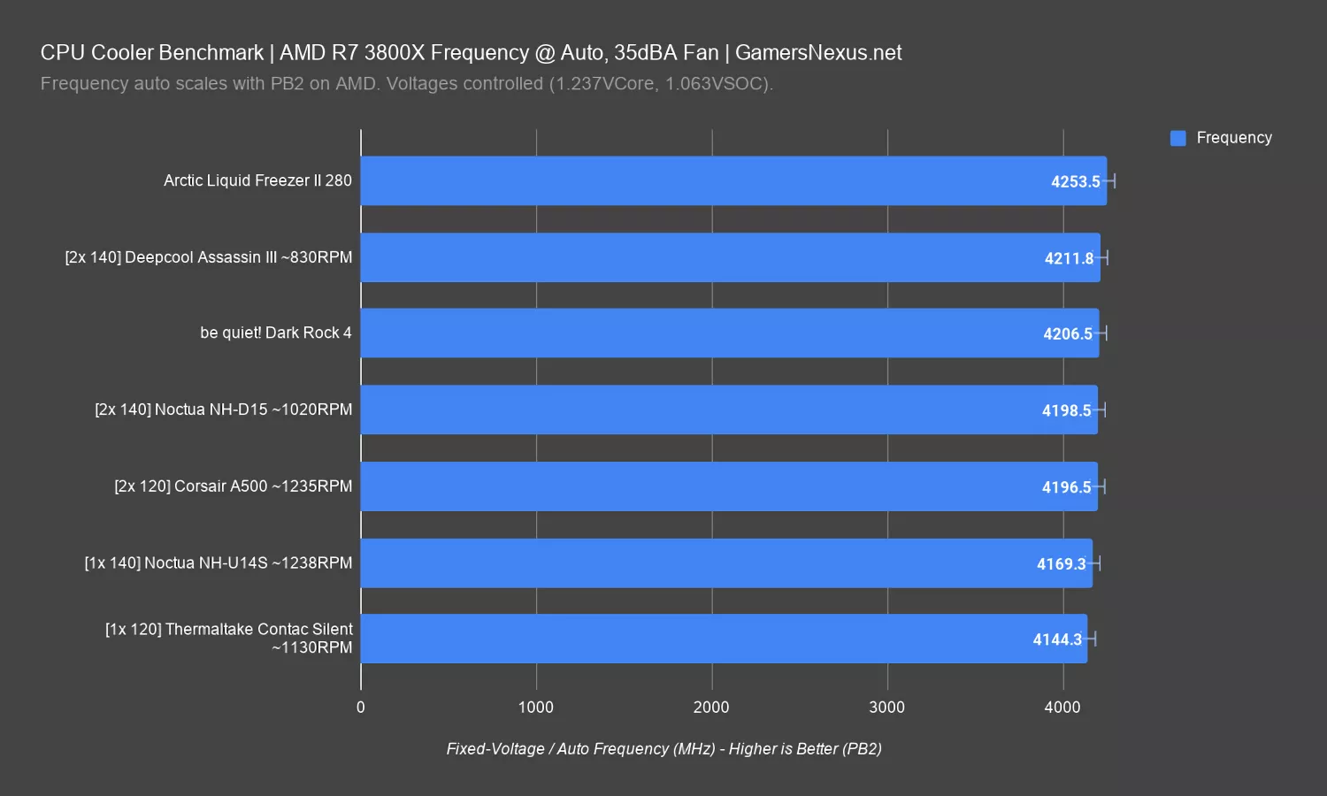 For auto frequency and normalized to 35dBA, the Liquid Freezer II chart-tops with the 3800X at 4253.5MHz all-core average, followed closely by the big air coolers. The Noctua NH-D15, be quiet! Dark Rock 4, and DeepCool Assassin III are all within error and test variance, as is the Corsair A500. Gaining an extra 50MHz over a high-end air cooler is about the difference you can expect if you’re not planning to overclock - the X62 would be in here as well with the Arctic cooler.