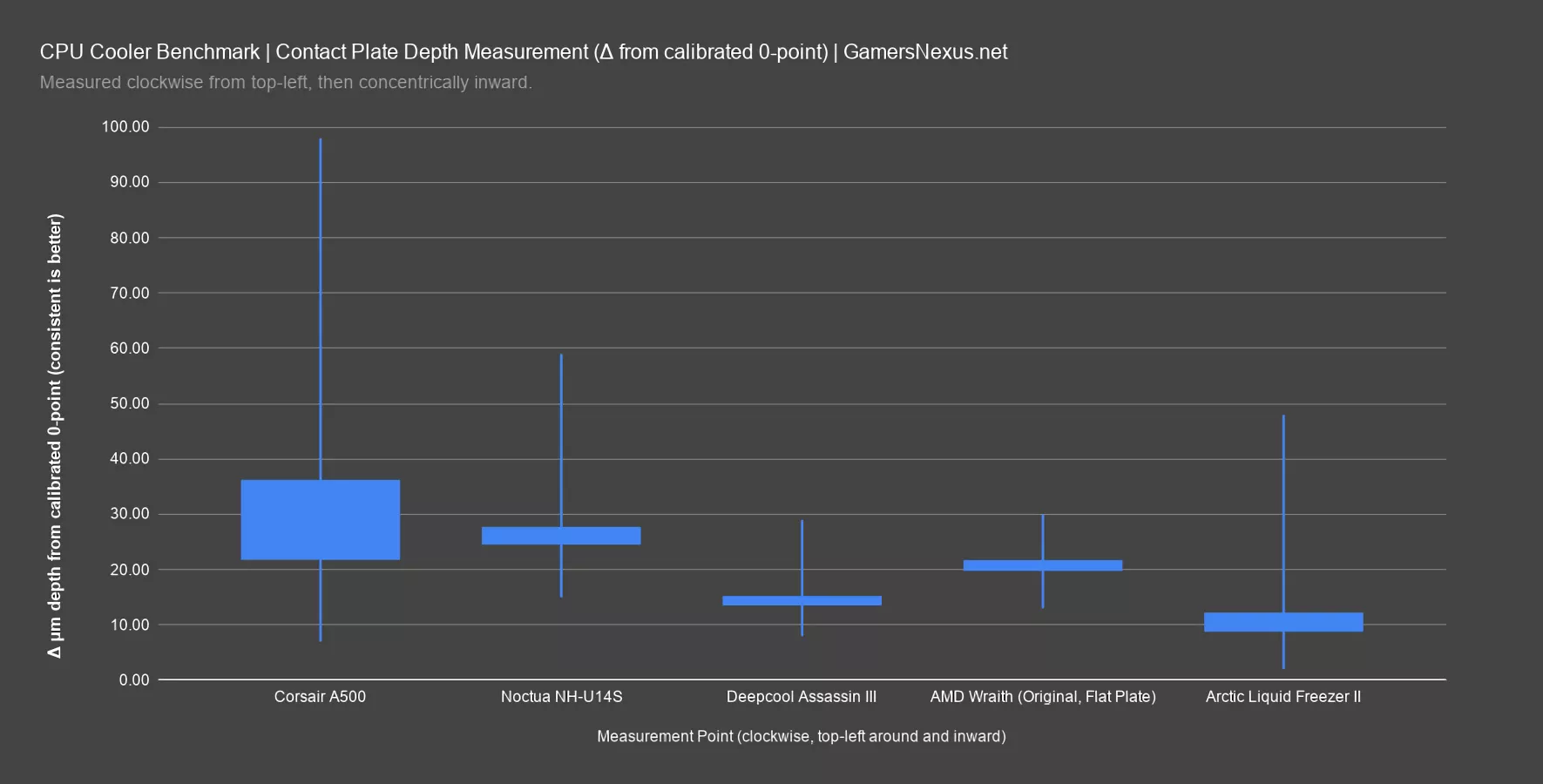Our next test is for the levelness of the coldplate surface, measured with special precision instruments for testing that we debuted in our Corsair A500 review to show its biggest pitfalls. This testing helped illustrate where the A500 went wrong, and it was in the levelness of the coldplate, causing large gaps that required more TIM to fill than was reasonable for a $100 product.