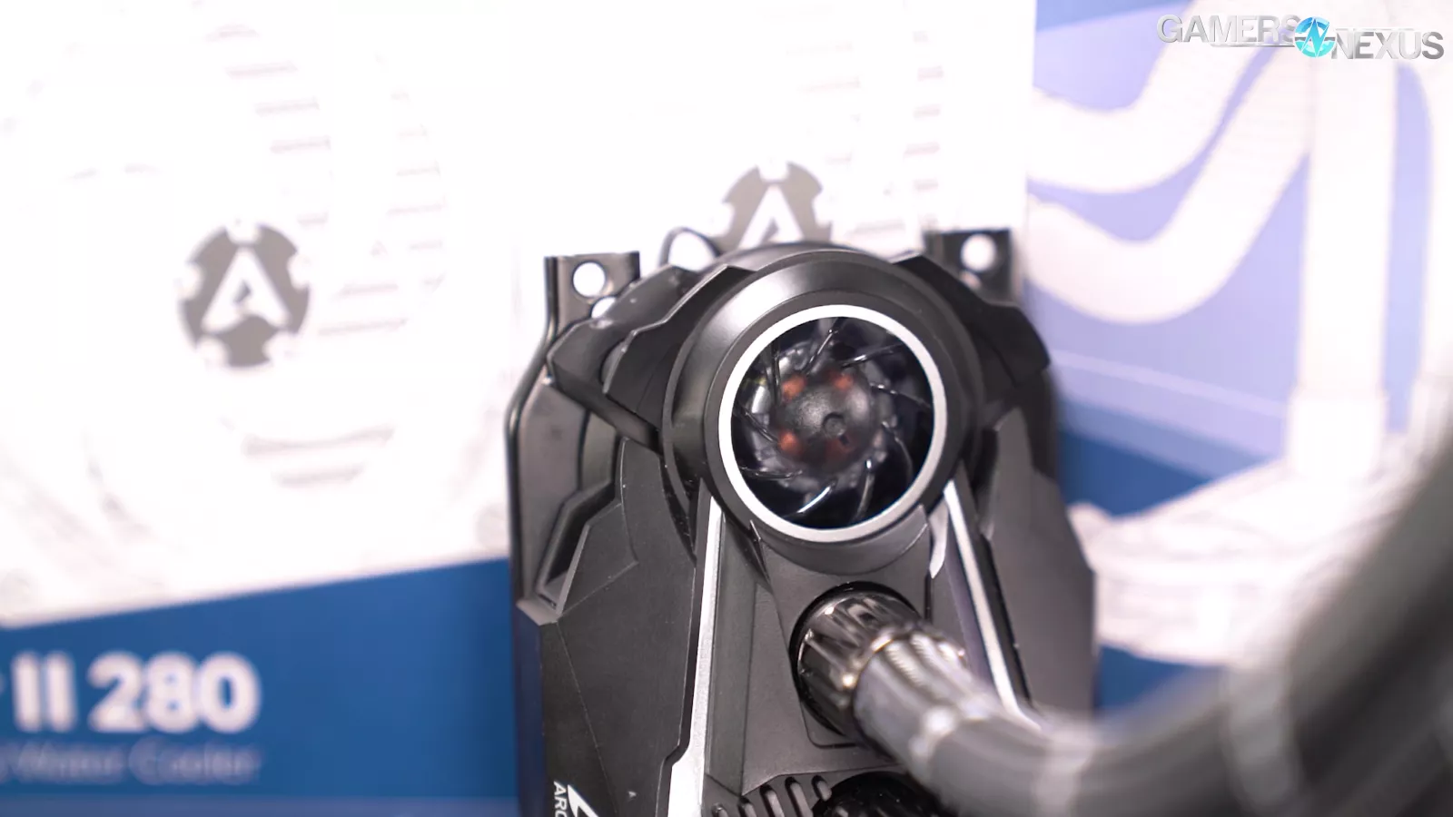 As with most liquid coolers there’s a lot of different radiator sizes for this, but we have the 280mm that we’re reviewing today. We’ve done dozens of liquid cooler reviews over the past three years or so, and we’ve just booted up our new test bench that includes air cooler reviews. Critically, our new test bench bakes in the new VRM thermal testing. We've been slowly collecting this information and we can finally look at whether this included 40mm VRM fan on top of the pump housing actually does anything or if it’s a complete – as opposed to partial – gimmick.