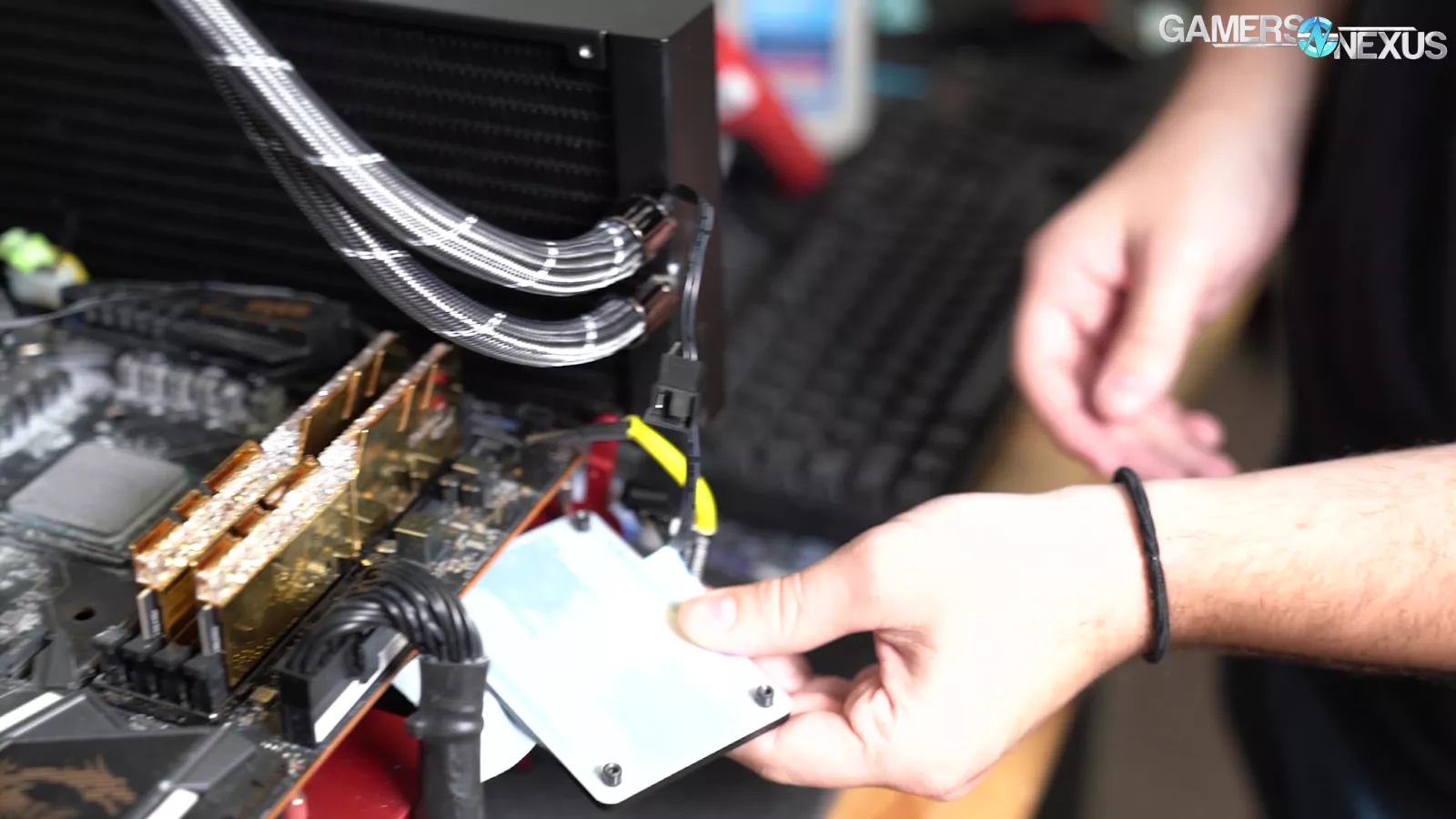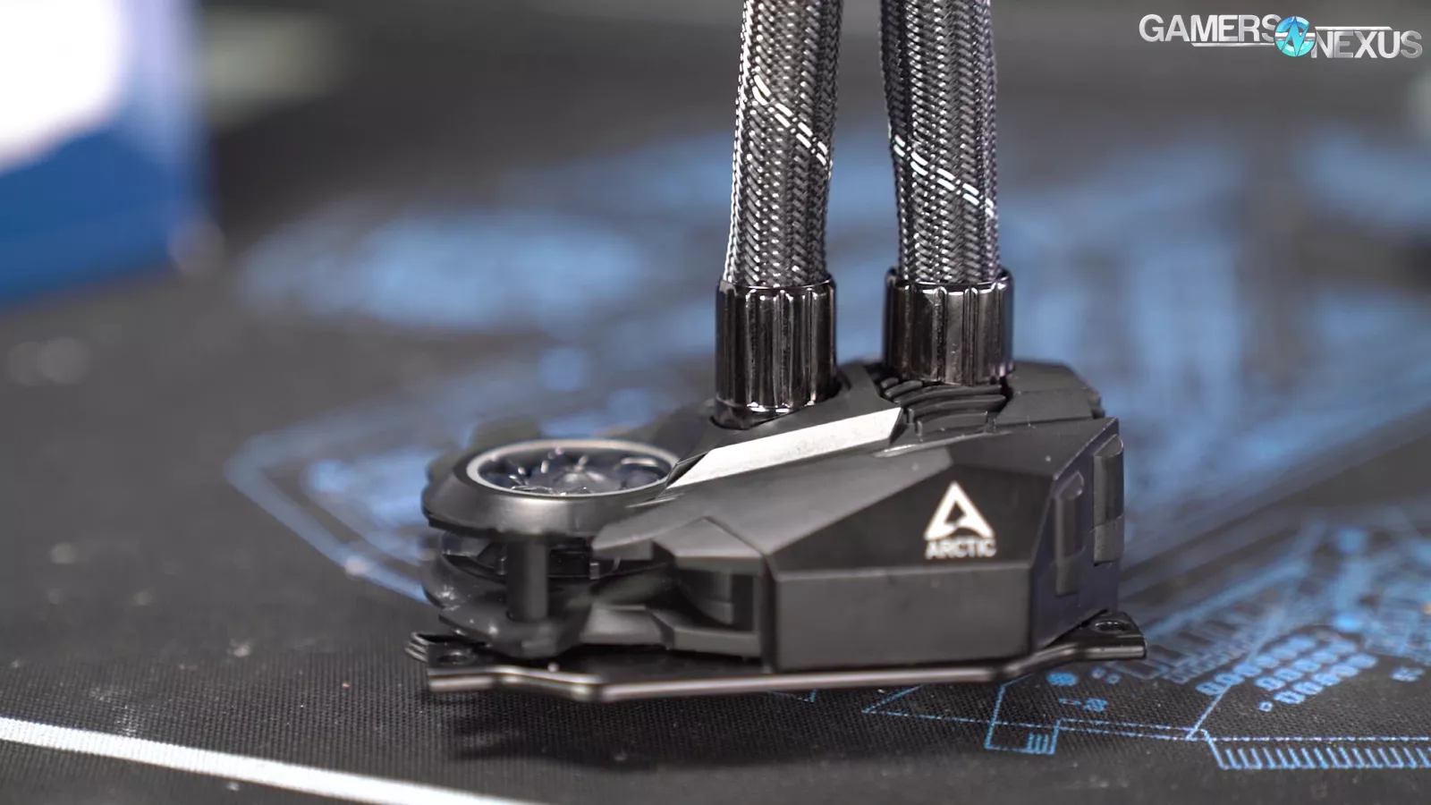 The pump is part of the block on the Liquid Freezer - you can actually see the part on the bottom of the pump where the impeller is located. We also have a separate tear-down for this. The VRM fan plugs in separately to the underside of the block. You cannot control the VRM fan through BIOS, but it’s also fairly quiet – you can’t hear it over the rest of the system noise. You can disconnect the fan if you want to, which is how we performed our “AB” test for VRM thermals.