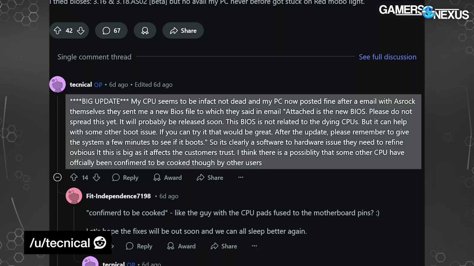Other users claim they “revived” their seemingly dead CPU by downgrading to a previous BIOS, and ASRock sent two users a then-unreleased BIOS that resolved their issues, but asked them not to share it.