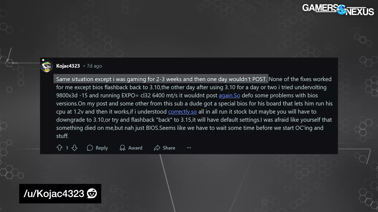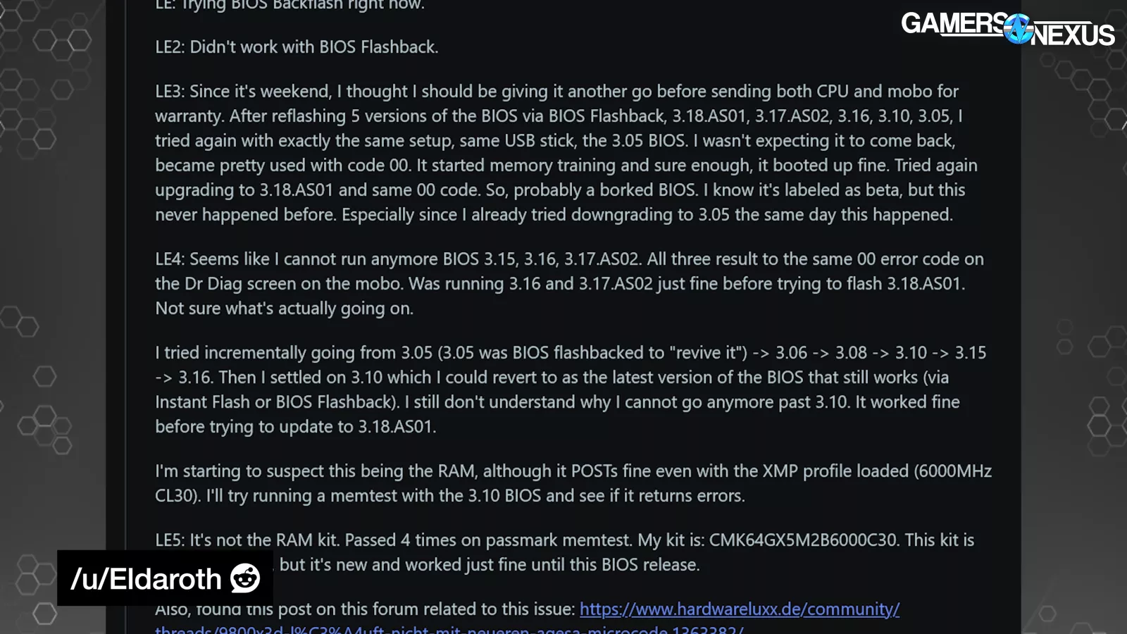 User u/Eldaroth explained that a 3.10 flashback didn’t immediately solve the problem, but after a second attempt at a 3.05 flashback, Eldaroth was able to “revive” the system. From there, the user flashed back to newer BIOSes and found 3.10 was the latest option working for the build.