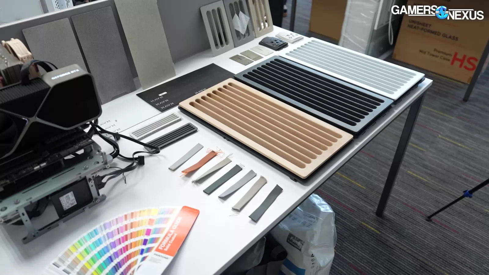 Hyte showcased its new X50 case, which is its most mechanically complicated product to manufacture to-date. The X50 uses a bubbly external look while attempting to be the highest-performing case on benchmark charts. Hyte uses a front panel that’s perforated all the way around the apex of the turn, leaving only a small strip at the mounting point for rigidity. The case also has louvered slats at the back, including for the PCIe slots, which add mechanical and manufacturing complexity but strengthen the chassis structure while improving airflow performance. Hyte noted that its intent, which we’ll test in our review, is to help project air away from the system, highlighting that there’s always focus on reducing intake impedance but noting that exhaust impedance is similarly important.