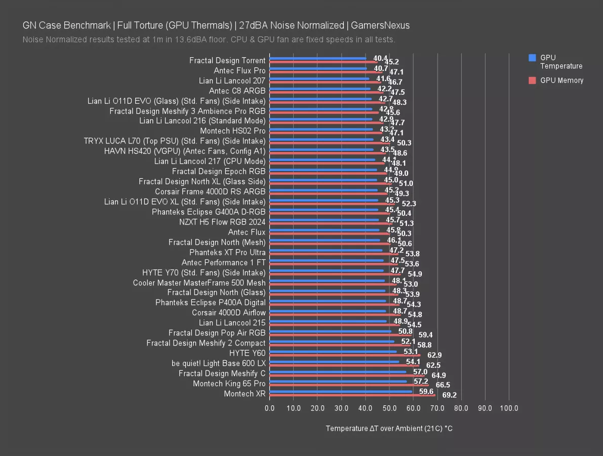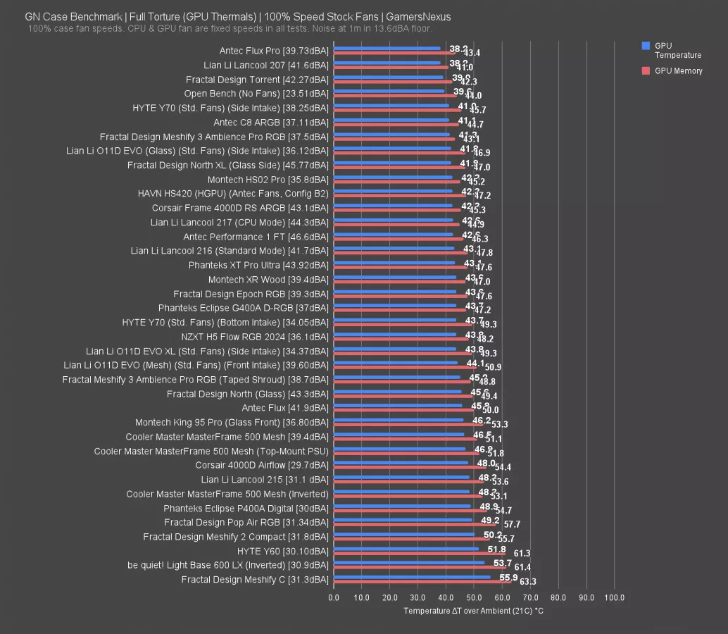 Moving to GPU thermals in the same test, the average GPU temperature in the MF 500 was 48 degrees Celsius above ambient and 53 degrees on the VRAM. That's behind the competition again, with the Frame 4000D RS averaging 45 degrees above ambient, the Meshify 3 averaging 43, the Flux Pro 41, and the Torrent 40. The MF500 is also beaten by the normal, cheaper Antec Flux.