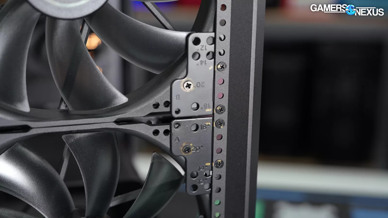 Fans can either be centered by using tabs that attach to the edges of the case, or installed off-center using a long rail. The rails are sized to fit the sides/bottom/top and the tabs fit the front/bottom/top. We would have liked a couple of extra tabs to work with. Cooler Master lists compatibility with 120, 140, 180, and 200mm fans, but because the holes along the case perimeter are spaced 1cm apart, the rails in particular are compatible with any fan size under 200mm.