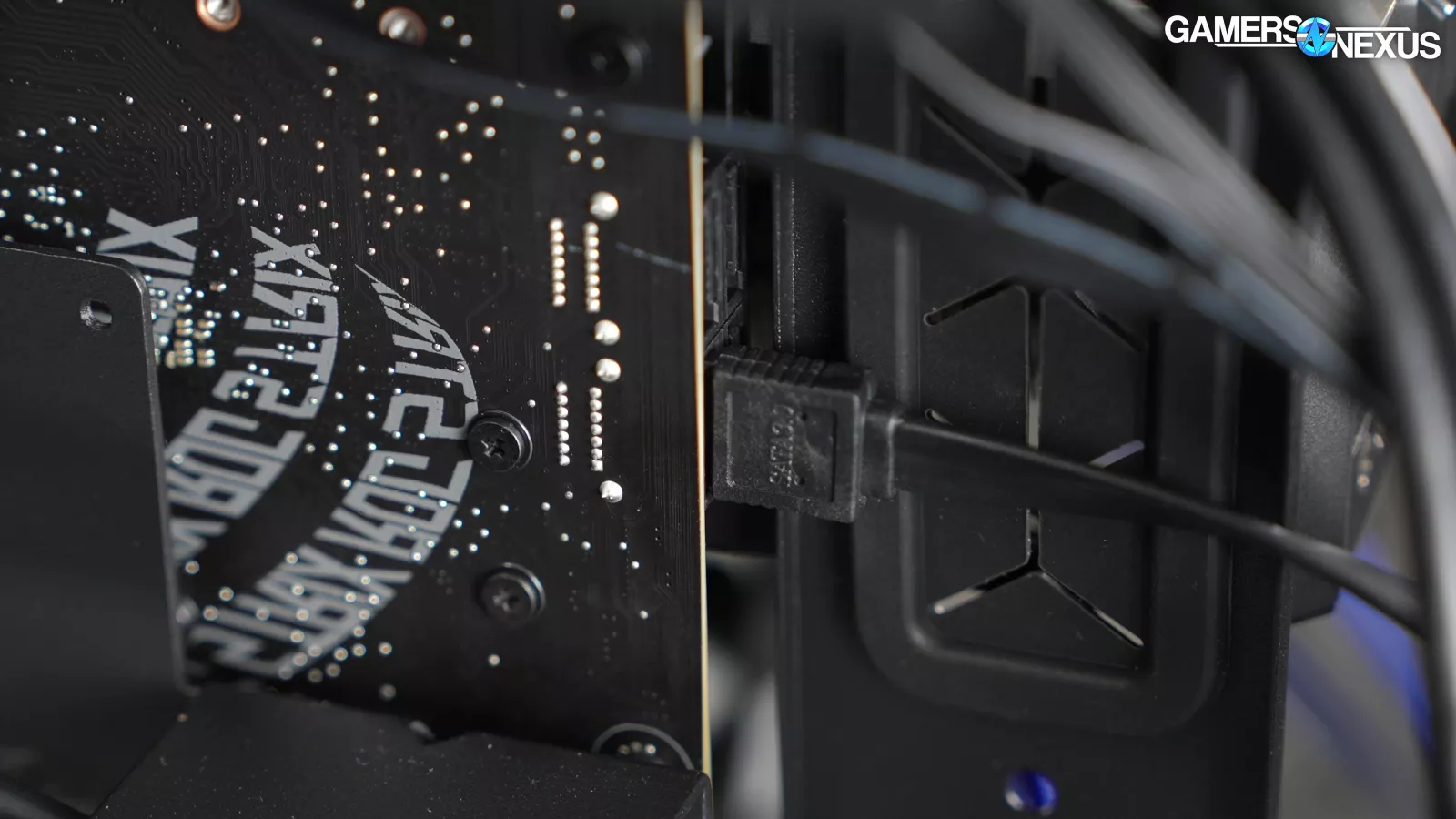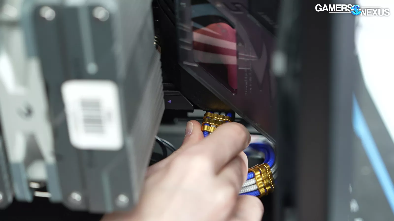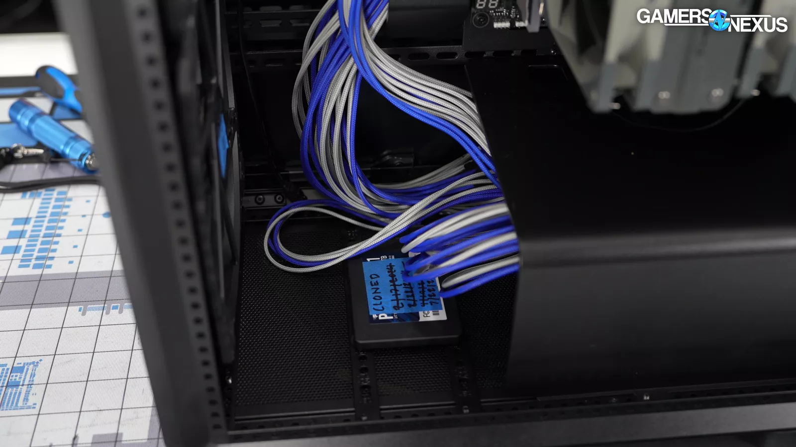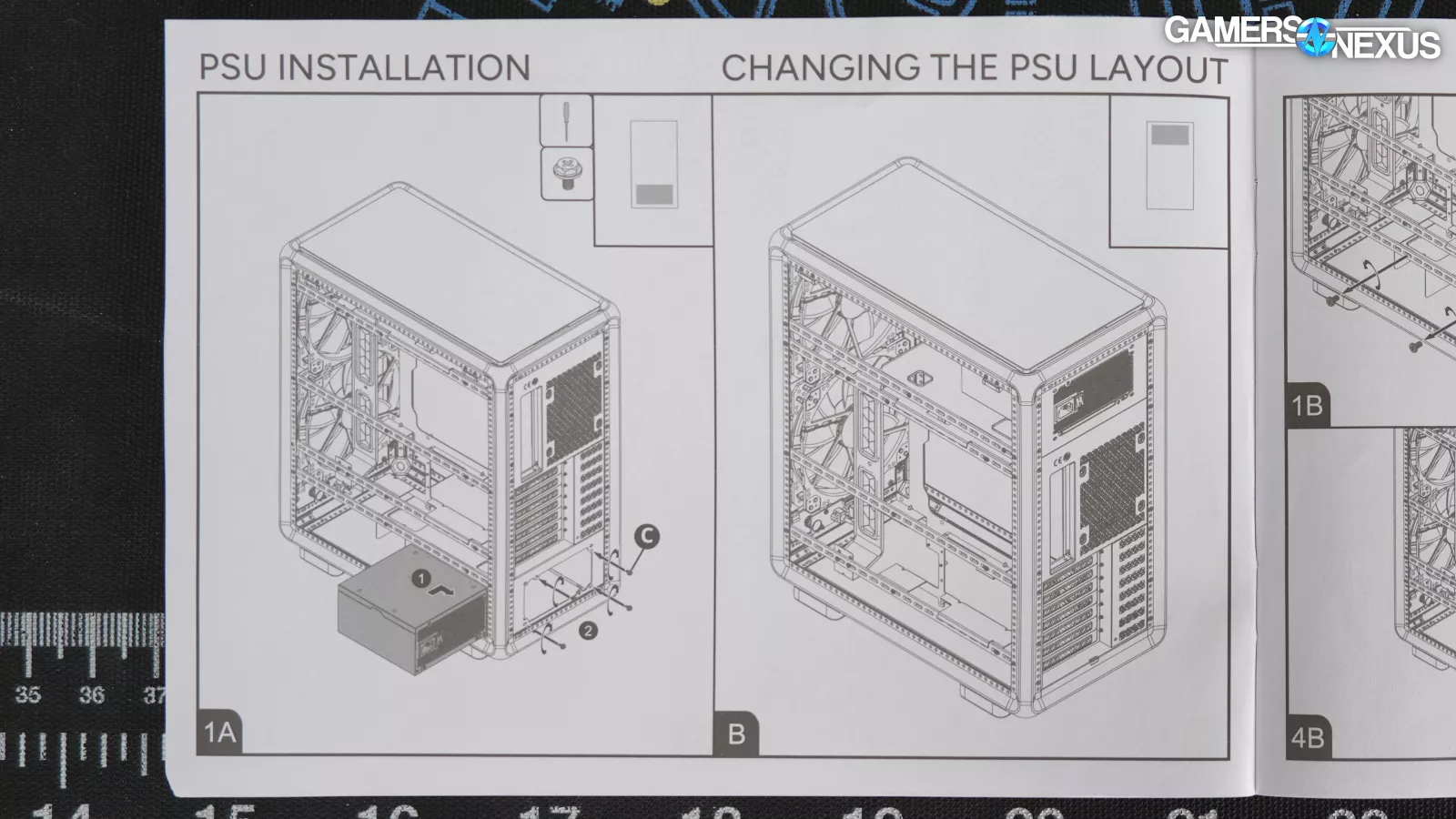 In all configurations, we kept the PSU fan oriented to pull air from the exterior of the case (facing away from the PSU shroud). The GPU support was not installed for any thermal tests.