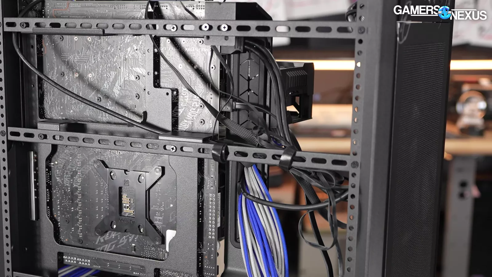 This is one of those cases where you have to remember to route cables under supports or else the side panel can't close. The cutouts that the power cables must be routed through aren't all lined up with each other, either, so it takes some indirect routing. The motherboard tray is structured so that when the PSU shroud is moved to its secondary location, you have to remove the end of the shroud and route cables through that path rather than behind the motherboard tray, making it significantly harder to hide cables.