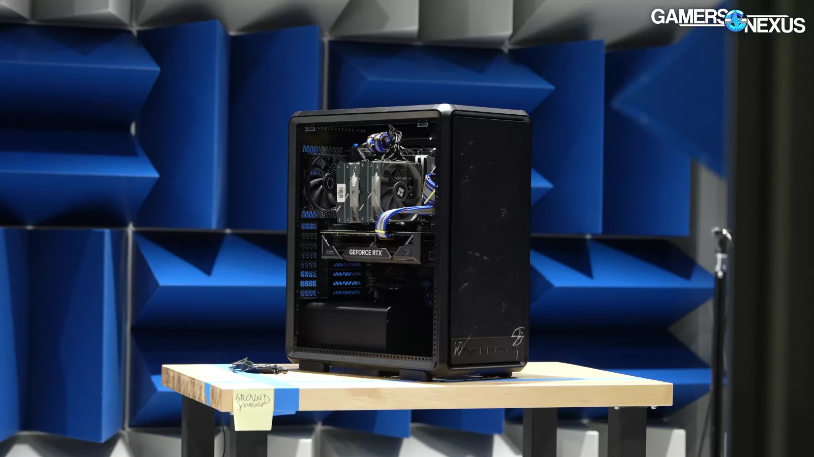 We'll start with noise normalized testing, where we step down case fan speeds inside our hemi-anechoic chamber until we hit our 27 dBA SPL target, measured one meter from the front of the case. We published a video showing our process to build this chamber previously and have gotten regular use out of it since it was built. This allows us to control our acoustic environment so that outside noise doesn’t affect our results. Test hardware like this is made possible through your support on store.gamersnexus.net.