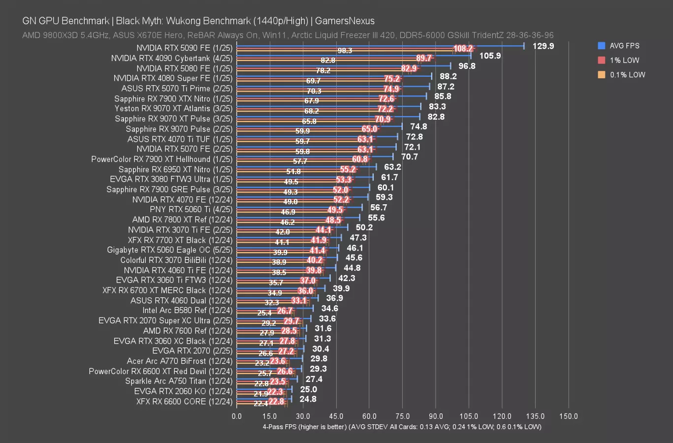 At 1440p with ray tracing, the RTX 5060’s 50 FPS AVG tied it with the 4060 Ti 16GB and 3070. The 7700 XT seems like a particularly useful landmark for future benchmarks and reviews.