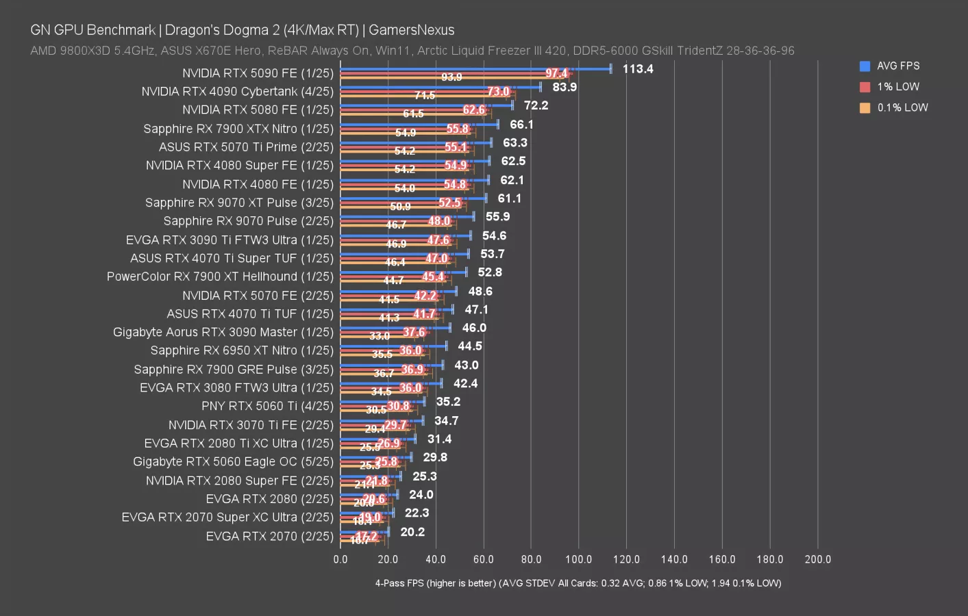 Dragon’s Dogma 2 with ray tracing and tested at 4K has the RTX 5060 at just 30 FPS AVG, which we all know humans definitely can’t see faster than, and so this card is basically perfect. Just like Jensen said.