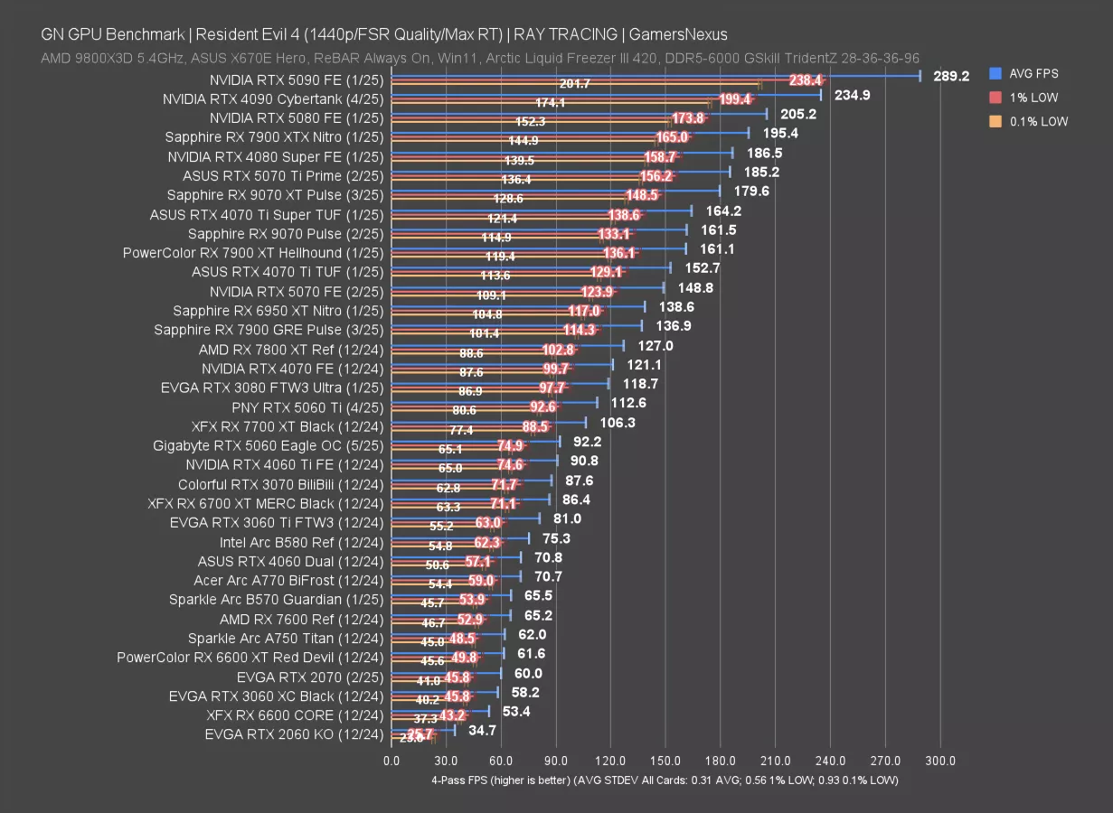 Resident Evil 4 at 4K is up now, this time ray traced and with upscaling. The RTX 5060 ran at 55 FPS AVG, again roughly tying it with a 3070 and 6700 XT. The 5060 Ti is again around 22% better than the 5060 in average FPS here, with lows improved proportionally.