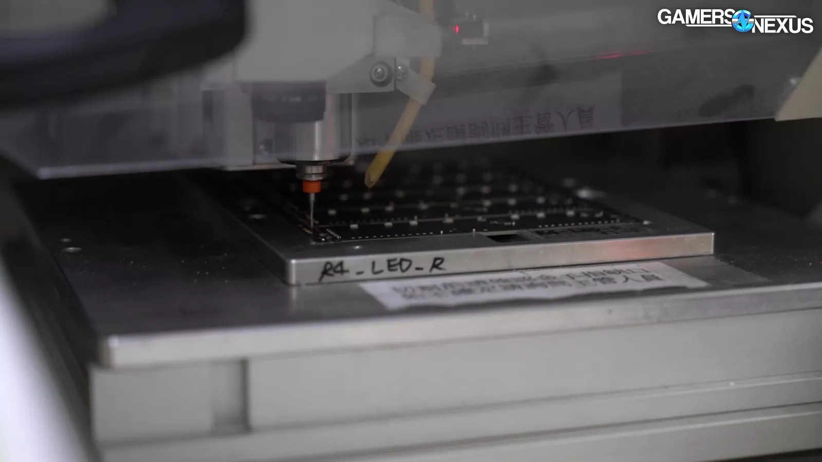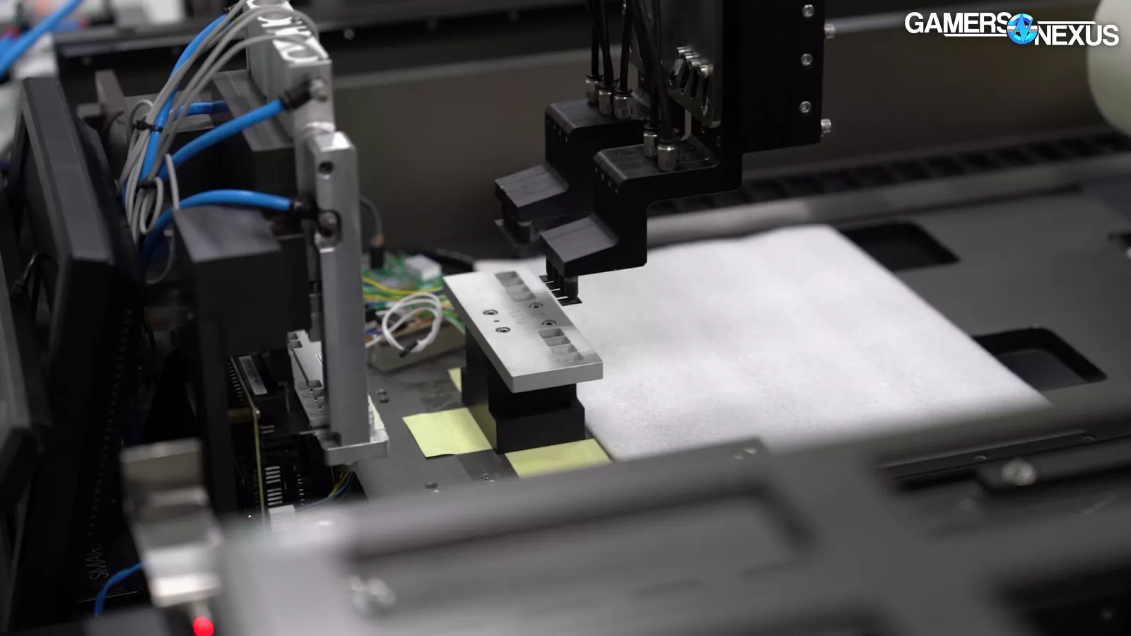 In this shot, we can see the memory chips themselves getting placed on the PCB by the robotic arm, before and after each movement it’s optically scanning to ensure accurate placement prior to baking.