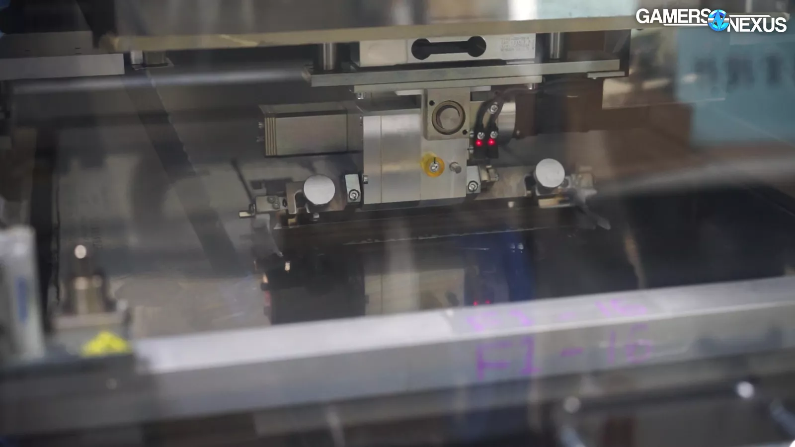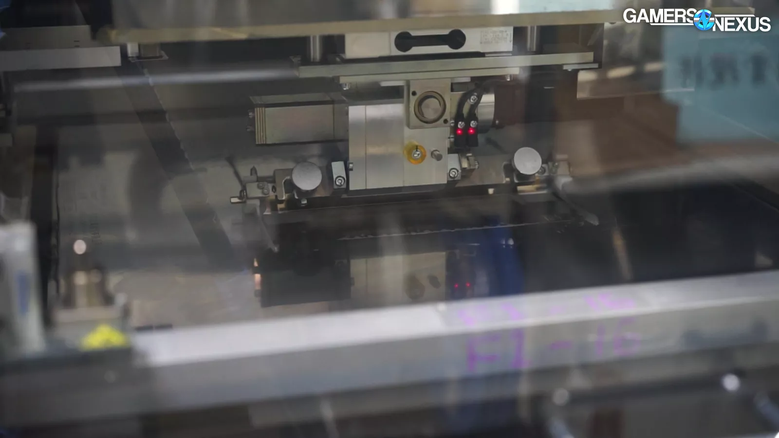 We also have a few shots where they paused the line for us to see the interior of the machines, but they had to be turned off for these shots. You can see each of the reels feeds into this like ammo belts, with the moving head actuated by gas lines and compressed air.