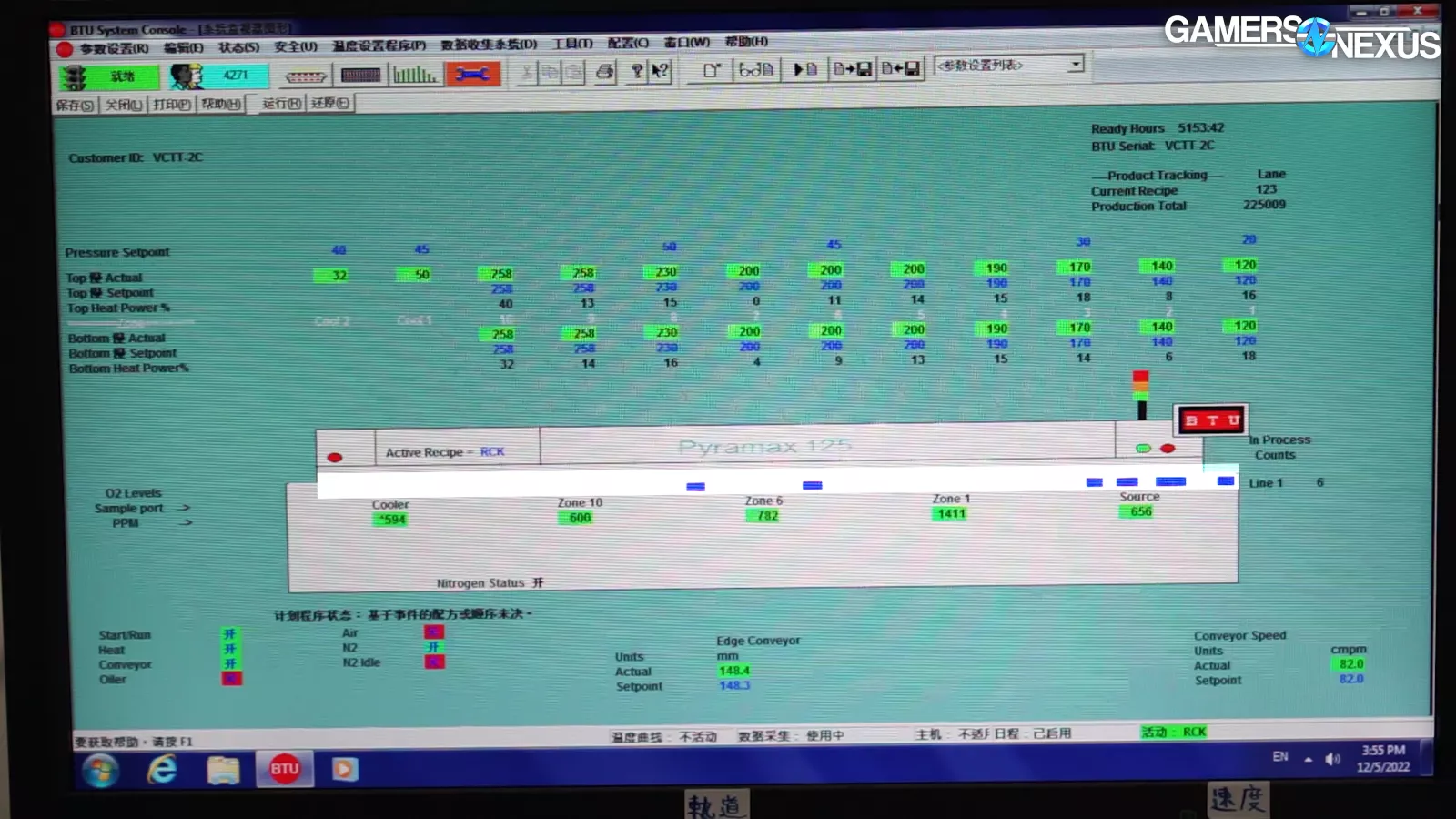Checking the monitor, we can see where each batch of memory is in the process. The blue blocks represent where the batches are. They move from right to left. The bottom right gives away the speed: This belt is moving at 82 centimeters per minute. We normally aren’t allowed to shoot these screens, so this is one of the shots we were the most excited about because it shows a commander’s view of the line.