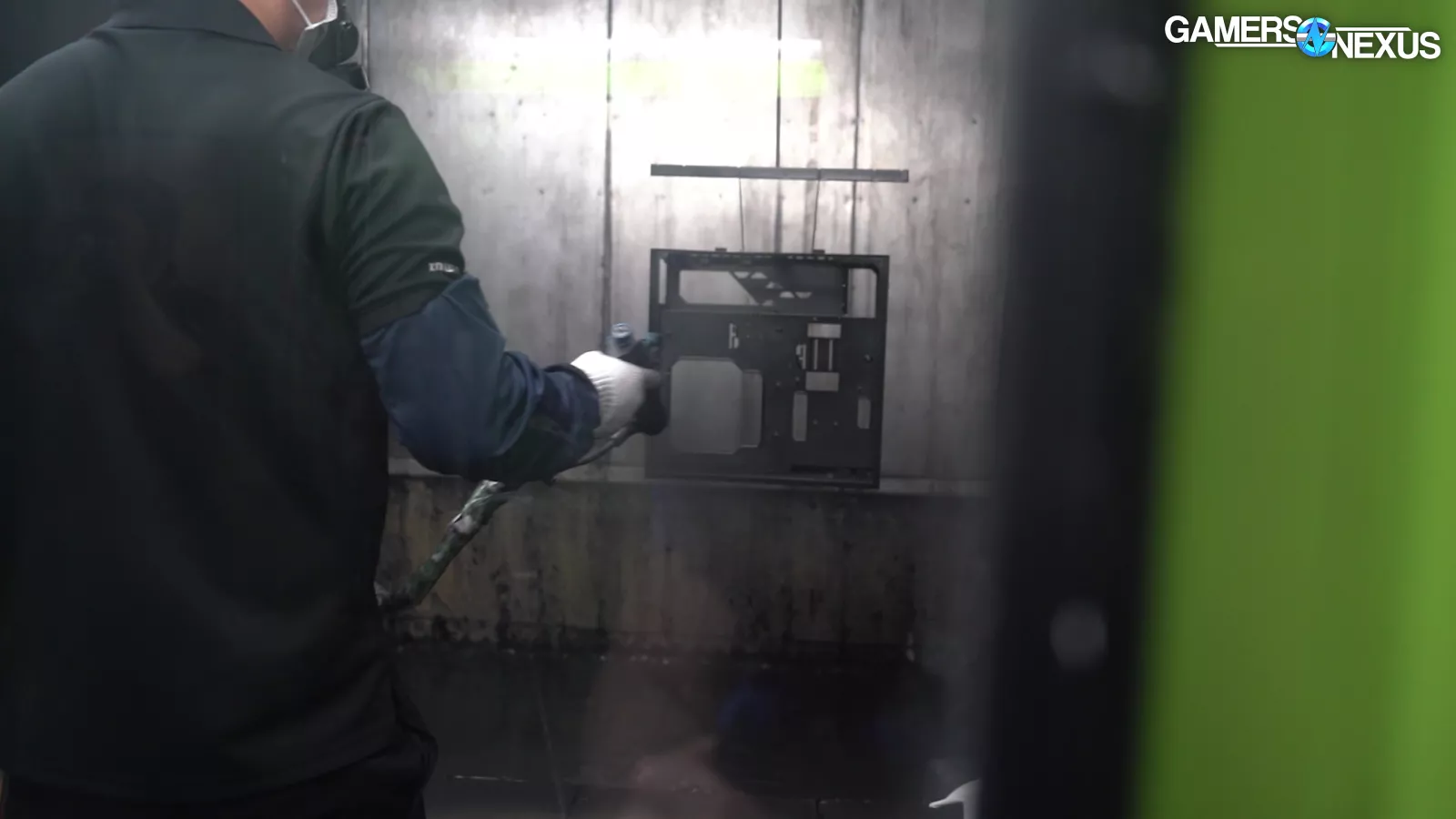 These waterfalls help wash the overspray down into a catch basin mixed with paint and water, amounting to millions upon millions of liters of use annually. The factory is able to recapture and reclaim much of the water and squeeze the paint out -- which is something we showed in a prior Lian Li painting factory tour -- which reduces usage.
