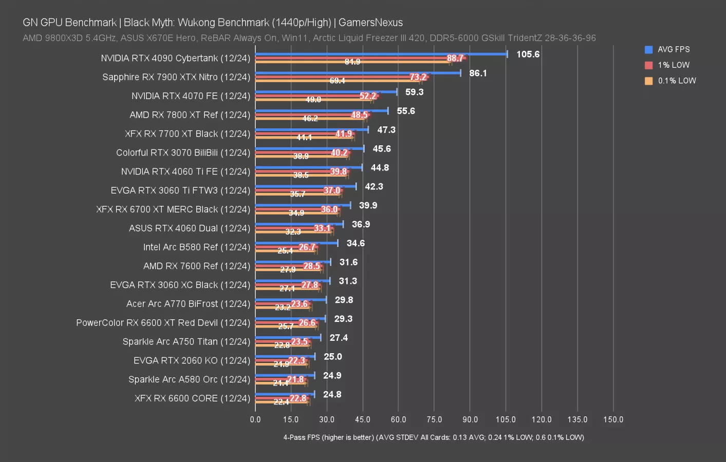 At 1080p and with FSR set to quality, using high raster settings and medium RT settings, the B580 ran at 34 FPS AVG, with lows where they should be. Intel’s last-minute driver change did nothing to our results -- they were nearly identical, so we’re just showing one set here. The B580 ranks alongside the RX 7800 XT (watch our review), as AMD has serious difficulties with this game. Wukong is similar in performance to Cyberpunk in its performance characteristics on AMD, where even a 4060 outperforms a 7900 XTX.