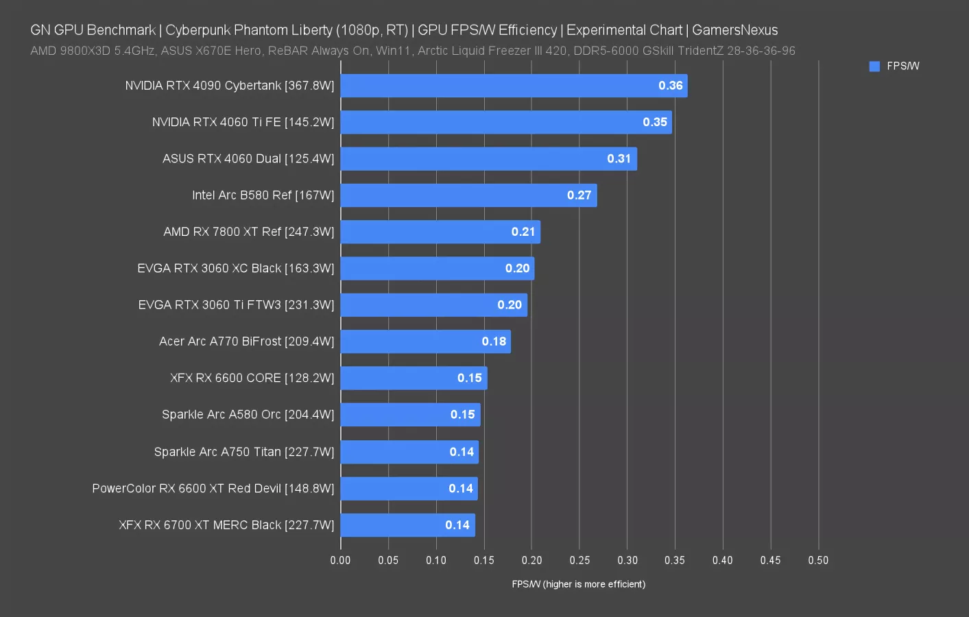 FPS/W is easier to understand for most people. In this test, the RTX 4060 Ti has the best FPS/W performance, up at 0.71. The 4060 Ti is about 37% more efficient, meaning its FPS/W score is 37% higher than the Intel B580. This is still a massive generational improvement for Intel, where its A580 previously was way down at 0.31. The B580 scores 68% higher in FPS/W than the A580 and A750. Its total power draw is about 141W here, the same as the 4060 Ti, and so the reason its FPS/W is lower is because its framerate is simply lower.