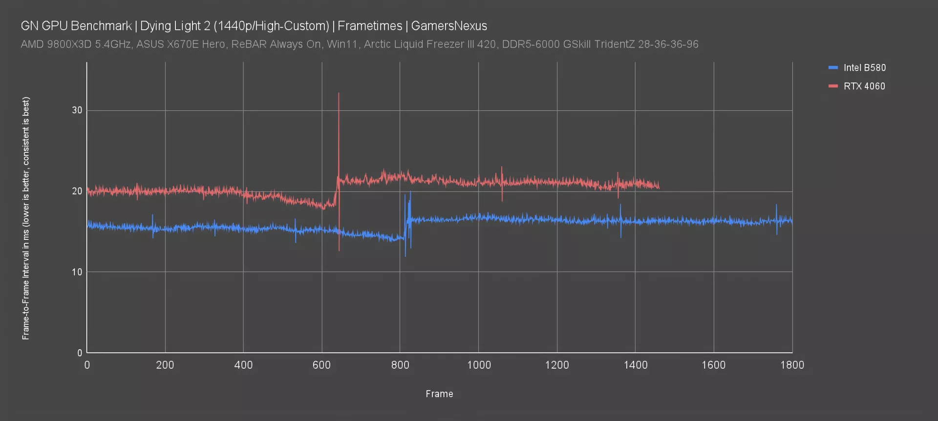 This shows 2 test passes from Starfield at 1080p for the B580. In this one, you’re seeing wildly inconsistent frame pacing with a total range from 13ms to 53ms. There’s no pattern to it and frame delivery is overall erratic, making the experience less consistent and allowing more microstutter behaviors to emerge. Dying Light 2 looked much better for Battlemage.
