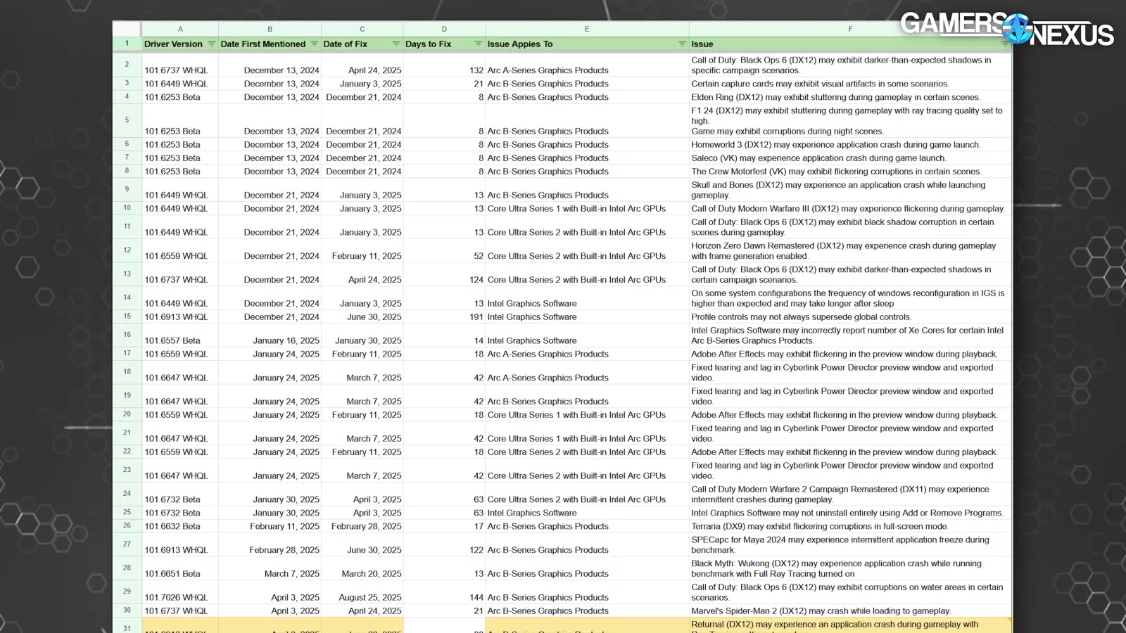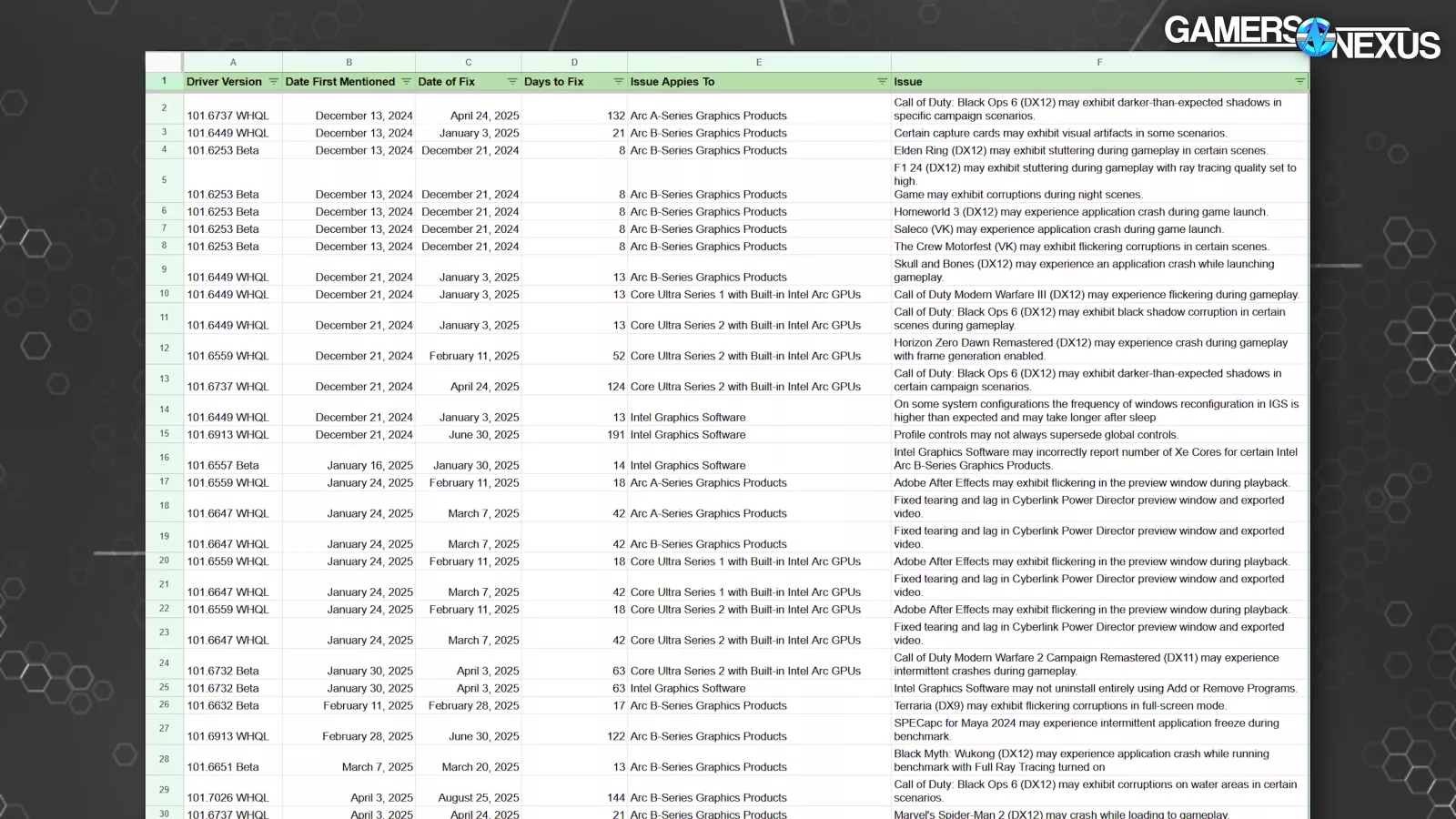 We built a gigantic spreadsheet to track 641 issues across Intel’s Arc GPU driver software for the past 10 months, compiled the driver release timeline to see how committed Intel is to new game releases and their speed of driver launches for those games, checked the game-ready driver launch lag, and clicked nearly every single button in Intel’s graphics software to see what features are broken -- and out of all of that, we only had one catastrophic crash that seemed to break the drivers.