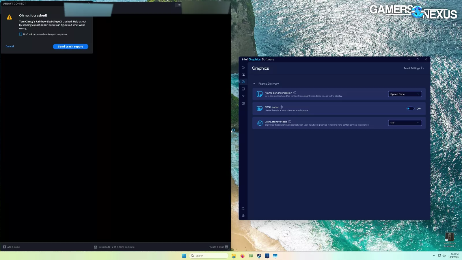 Trying to use Speed Sync with Siege caused the game to consistently crash on launch. This isn’t mentioned as a known issue that we could find on the Arc patch notes, but there are sporadic reports of similar issues around the internet. Intel still has problems here.