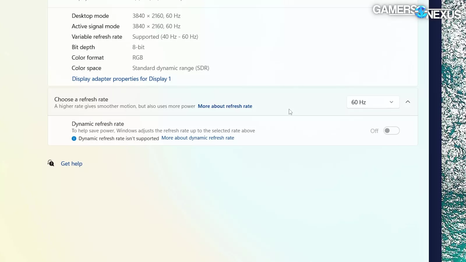 The Display tab of Intel Graphics Software has a toggle for Variable Refresh Rate, the bottom of the Display tab has “Variable Refresh Rate Mode,” and then separately, Windows has its own “Dynamic refresh rate” under the Advanced display menu, which isn’t supported in this instance even though the same page says that variable refresh rate is supported.