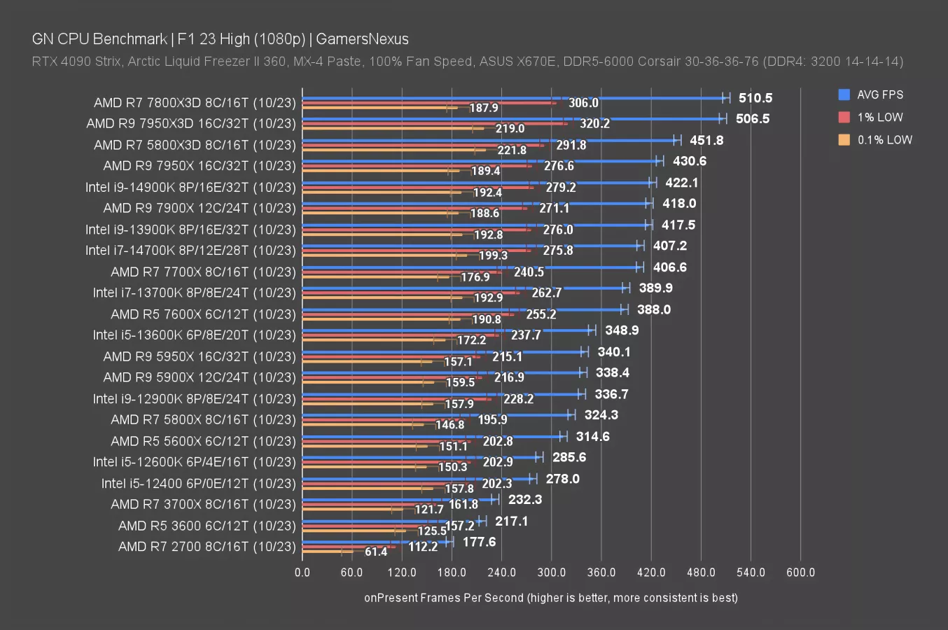 But, to be fair, this is a title where you’d want to favor Intel if you expect to be CPU-bound. The lead is a meaningful 23% over the 7800X3D for the 14900K.