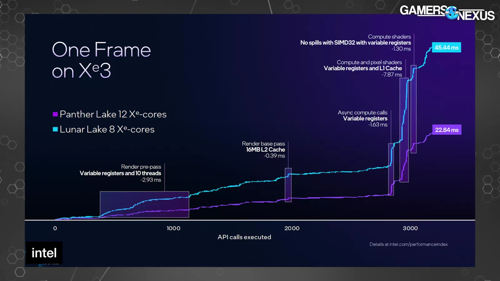 Of note, Intel shows an 8ms reduction to Xe3 with the compute and pixel shader section toward the end, assigning some of that uplift to the change to the variable registers and L1 cache size increase. We can also see that, according to Intel, the L2 benefits the render base pass with a 0.39ms improvement, preceded by the move to 10 threads (and variable registers) providing a 2.93ms improvement in the pre-pass.