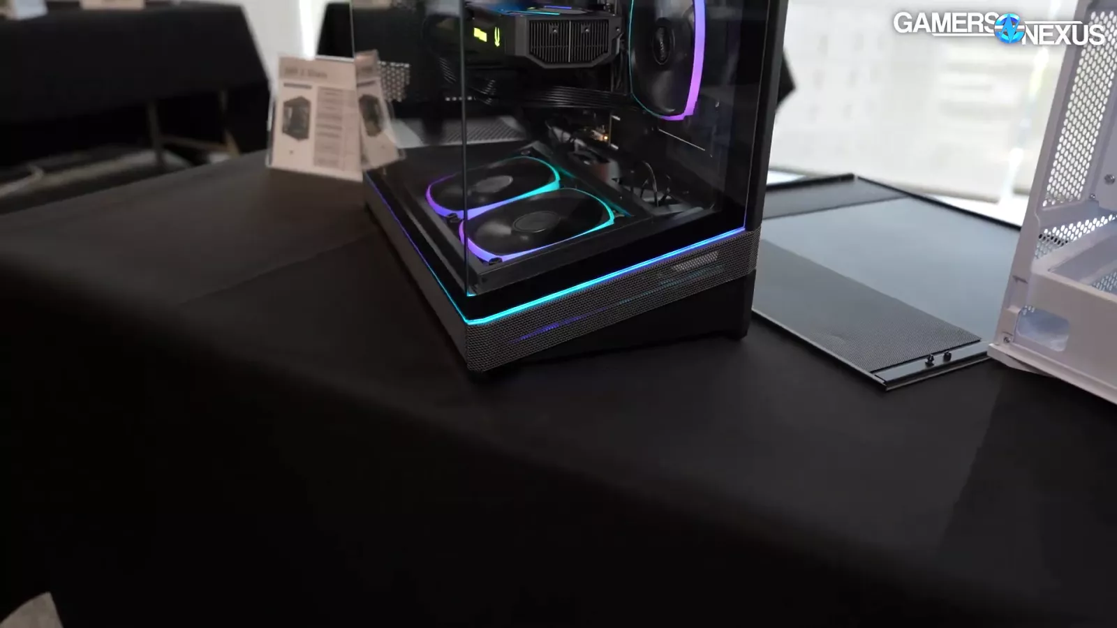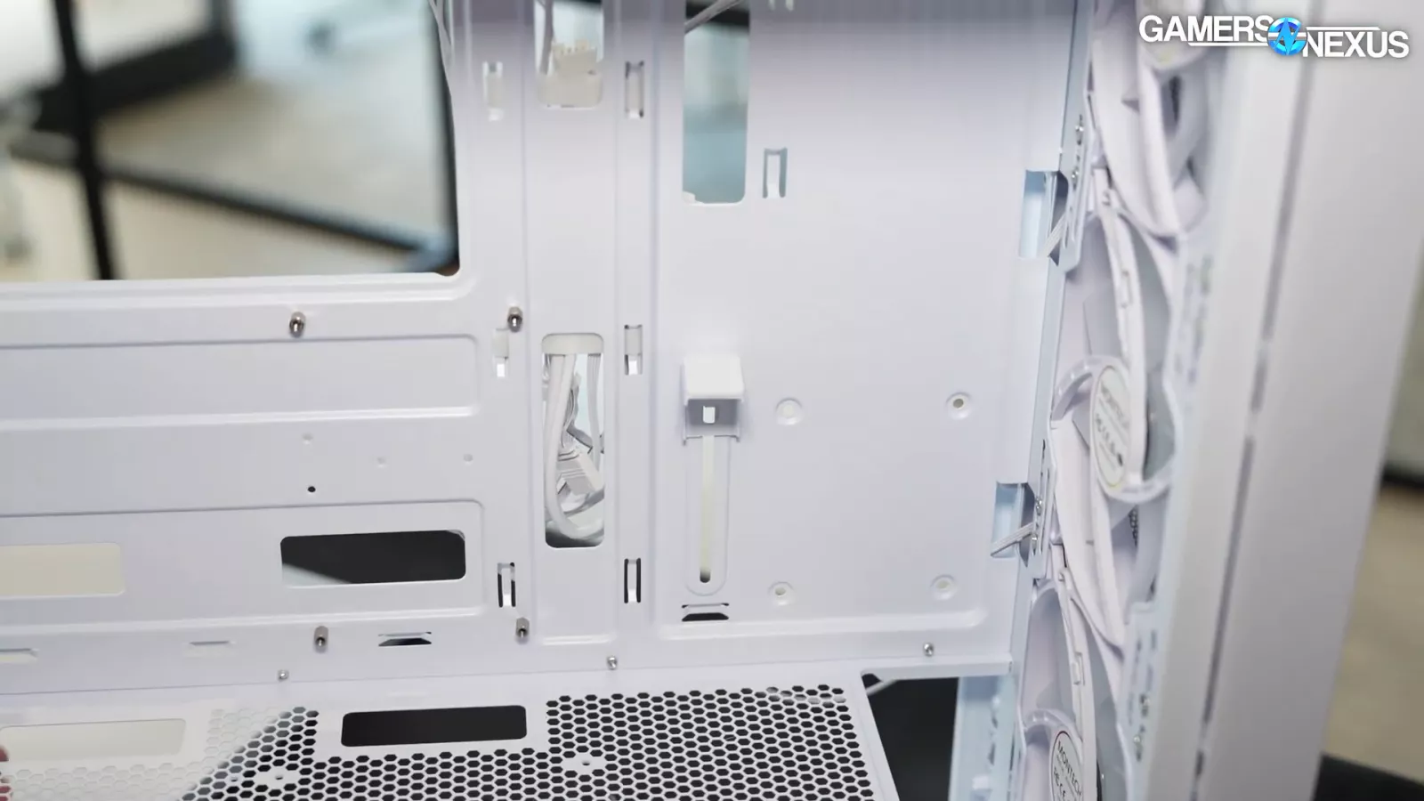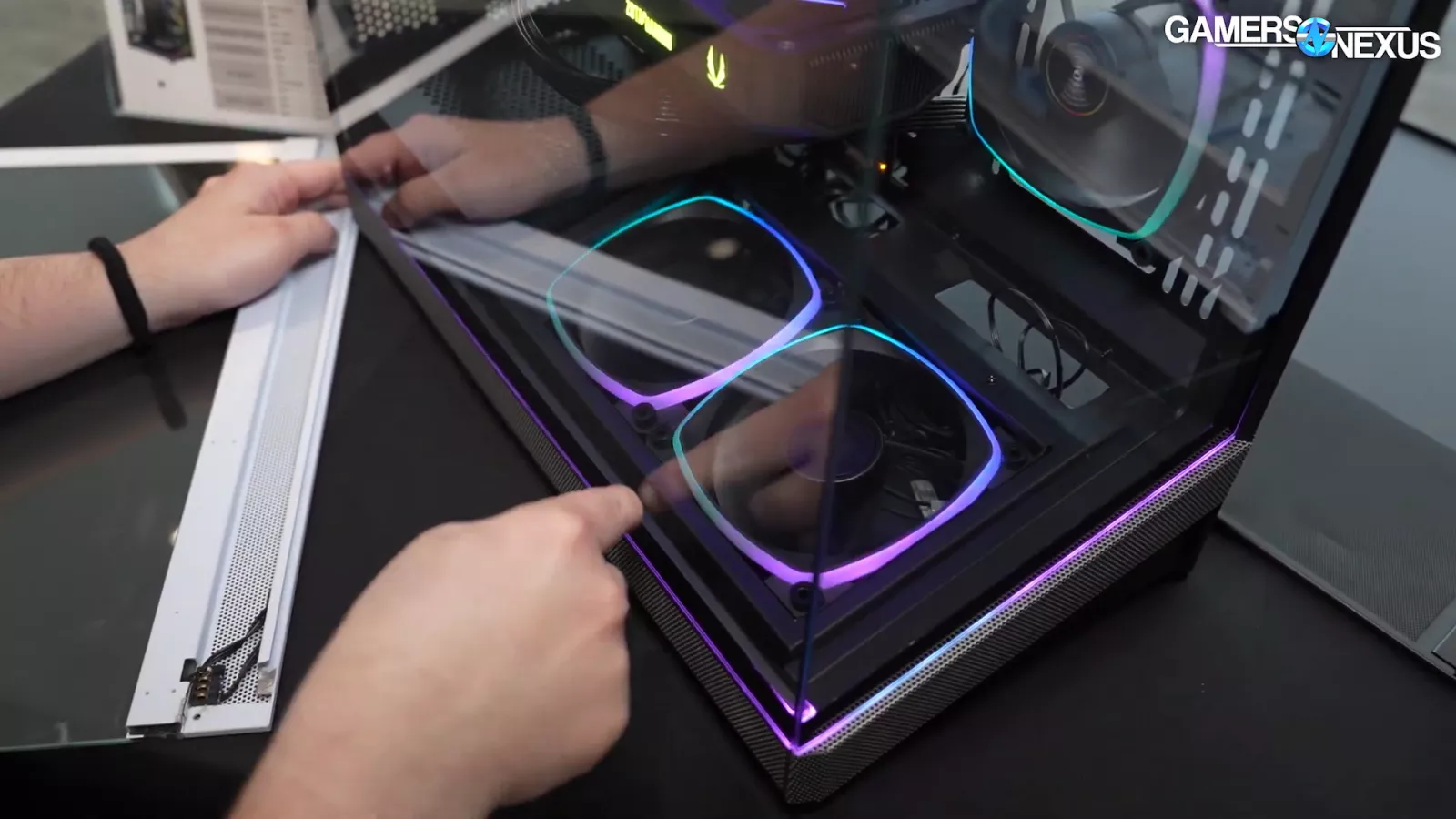 One thing worth pointing out is that its bottom fans are sunken into the bottom, which means they’re pretty close to the floor and the intake is primarily relegated to the back side panel of the case, where there’s a bit of an angle which should help with intake a little, but it’s still somewhat boxed in.