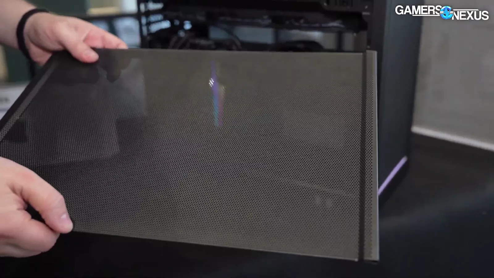 On the back of the case, it has large ventilated holes both vertically and horizontally. Taking the back panel off, one thing we’d like to see is refinement on the magnetic filters. Currently, they’re not done yet but you can see a lot of metal ending up in the hexagon-shaped cut-outs. If they could punch out larger holes or use a finer mesh and get rid of the dust filter or something like that, that would help a lot with thermal performance and letting air through.